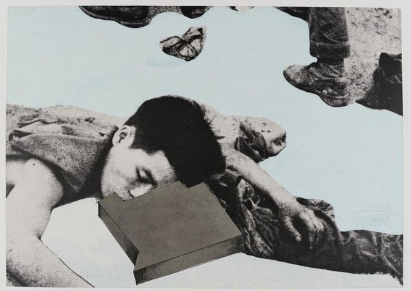Curator: Wolf Vostell's print, titled "Saigon," uses stark contrasts to create a chilling image. Editor: It's definitely unsettling. The textures seem almost abrasive, amplifying the horror. Curator: The central figure's expression is particularly powerful. His face seems to encapsulate a collective trauma experienced during the Vietnam War era. Editor: The composition is jarring, too. The superimposition of the executioner and the victim complicates the reading, like a collapsing visual field. Curator: Precisely. It speaks to how easily one's identity can be erased. This image calls upon a well of cultural memory and the burden of history. Editor: The stark monochrome palette also reinforces that feeling of historical distance, like a faded newspaper photograph. Curator: Indeed. A sobering reminder of how images can simultaneously document and distort reality. Editor: It makes me wonder what we choose to remember and how.