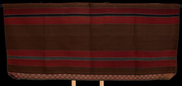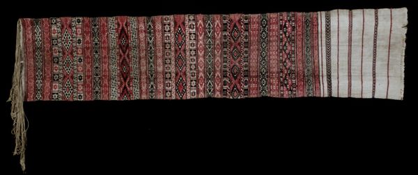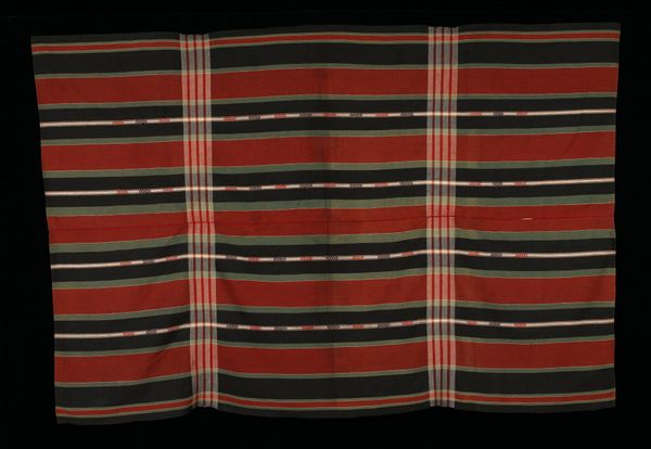 Curator: Let's take a moment to discuss this Ceremonial Skirt from the Haka Chin people; its date is unknown, but it’s part of the Minneapolis Institute of Art's collection. Editor: Immediately striking is its sombre, almost stark palette contrasted with the geometric intricacies. The weight of the textile comes across even visually. Curator: The patterns, predominantly geometric, hold significant cultural weight within Haka Chin society. Textile production like this goes beyond mere craft; it's deeply intertwined with their history, social structures, and, particularly for ceremonial items, spiritual beliefs. Editor: Absolutely. We’re looking at woven cotton, a material that, in this context, represents a whole system of labor, skill, and resources. Who cultivated the cotton? Who spun and dyed the threads? Understanding that production process is key to appreciating the skirt's value. Curator: And how these objects serve as signifiers of identity within a community. This skirt, for example, was very likely created and worn by women and could potentially represent very particular clan affiliations, status, or rite of passage. Editor: The repetitive patterns—diamonds, floral motifs—point to a painstaking weaving process. Each repetition involved intention and skill, it reflects time. Curator: The act of weaving, its materials, even its patterns were regulated, especially within textiles intended for ceremonial use. It’s essential to delve into who had the right to produce them. How that relates to gender and to social power. Editor: It prompts me to reflect on global supply chains and ethical labor practices even today. We are surrounded by clothing, and often disconnected from its creation. A skirt like this reveals all the unseen human labor. Curator: Precisely. Viewing the Ceremonial Skirt prompts necessary conversations around cultural appropriation, commodification, and agency. By examining not just the artifact but the community, labor and context surrounding it. Editor: It shifts my understanding of this from art object to a document of human existence, where we can really value and appreciate how things are made, then and now.