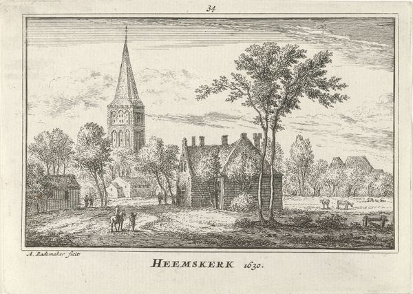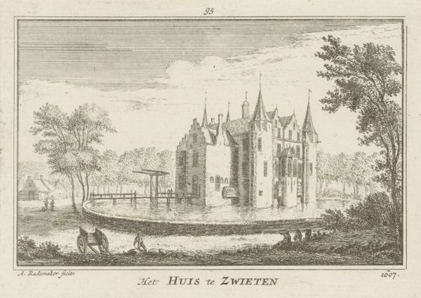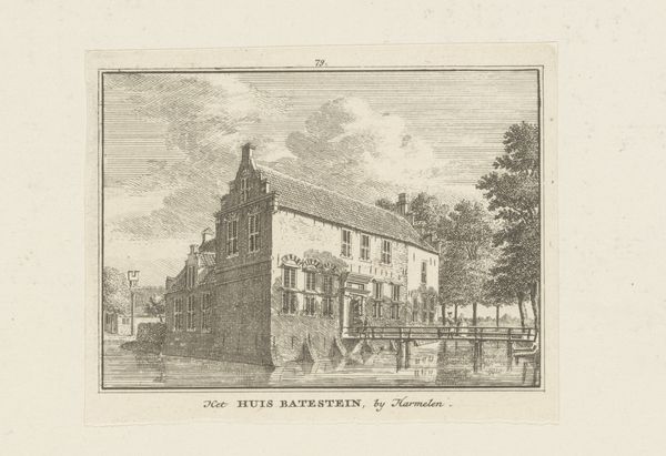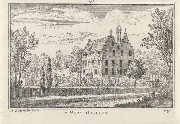 Editor: Here we have Abraham Rademaker’s “Huis te Hinten,” an engraving from around 1730. The precision of the lines gives it a rather formal, almost detached quality. I'm intrigued by the composition—it feels meticulously planned. What structural elements stand out to you? Curator: The interplay of light and shadow, achieved through varying densities of engraved lines, articulates the form. Note how the artist uses hatching and cross-hatching to define the volumes of the buildings and the reflective surfaces of the water. Observe the horizontal bands, too, created by the sky, architecture, and ground—how do these planes influence your reading of the work? Editor: They really flatten the scene and emphasize its linear quality. I see that the artist organized all of the visual elements into these very sharp angles that create balance and perspective, but it also sort of compresses the space, which keeps the view front and center. Curator: Precisely. Also, examine how Rademaker employed linear perspective to establish a sense of depth, drawing the eye toward the vanishing point within the architectural elements. This establishes a structured relationship between the foreground and background and imbues a sense of order, wouldn’t you agree? Editor: Yes, absolutely. The controlled perspective amplifies the image’s composed structure. The balance is striking! I hadn't fully appreciated the control and thoughtfulness of Rademaker's linear technique. Curator: The success of this piece depends on your sustained contemplation of these structural dynamics, right? Ultimately, you might be capable of appreciating that, freed from considerations such as historical intent, its formal devices render this engraving aesthetically potent.