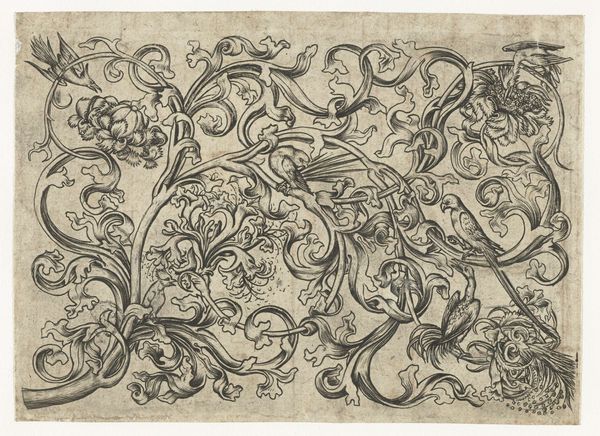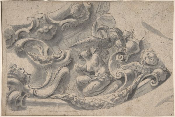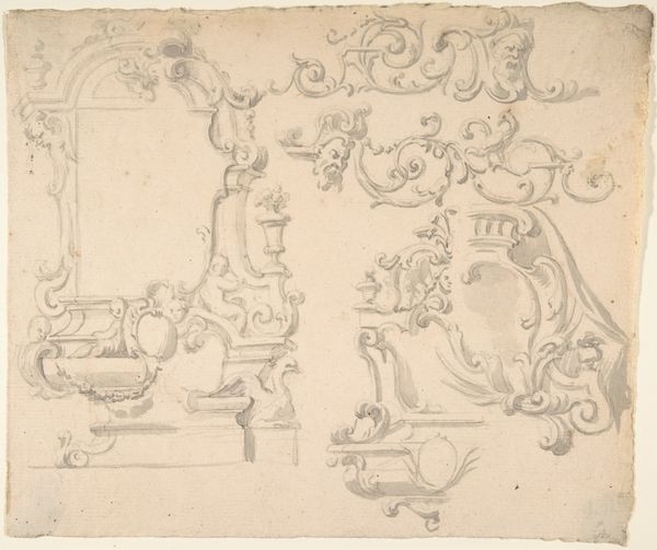 Editor: This is a pen and ink drawing from 1762 by Thomas Johnson. It’s titled “Design for a Tablet for a Chimney-Piece with Two Swans in Combat, Enclosed within a Scrolling Cartouche with a Water-Spouting Dragon's Head.” The title is quite a mouthful! I’m really drawn to the ornate details; it feels very symbolic. How do you interpret this work, especially considering its historical context? Curator: That’s a great observation. This drawing speaks volumes about the social and cultural aspirations of its time. The Baroque and Rococo styles were often commissioned to convey power and sophistication. Notice the prominent display of the swans "in combat" within the cartouche. Editor: Yes, I see how the warring swans are at odds with the delicate curves and ornamentation of the overall piece. Curator: Exactly! It might seem paradoxical, but the inclusion of these animals locked in a bitter struggle against each other brings attention to issues of identity, hierarchy, and power dynamics that characterized 18th-century society. Also consider, who was permitted access to such decorative items and the messages they convey? Editor: That’s fascinating. So it's not just decoration, it’s communicating complex messages about societal values? Curator: Precisely. What seems like a simple design proposal is, in effect, revealing a rigid social structure being bolstered through aesthetic choices. Moreover, the inclusion of mythical creatures reflects a society that was starting to mix classicism and new philosophical ideals during the Enlightenment. What do you think about this connection? Editor: I never thought of it that way. I guess I always assumed these kinds of drawings were simply decorative blueprints. Curator: Often these drawings reflected how identities were performed and perceived within specific social circles, which often meant upholding exclusivity. Looking closely at this drawing invites questions regarding class, privilege, and what such visual language excludes. Editor: I’ve definitely gained a new perspective on decorative arts. There's so much more depth here than I initially perceived! Curator: Indeed, delving into these intersectional narratives allows us to understand how aesthetics often operate as expressions of power, class, and cultural identity.