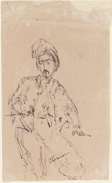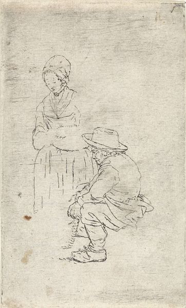 This is a drawing of an old man leaning on a stick, made by Rembrandt van Rijn. The loose and lively strokes of the pen against the simple ground, suggest a figure caught in a moment of introspection. The composition is defined by a vertical orientation, with the figure occupying most of the space, bent over, creating a sense of enclosure and reflection. Rembrandt's use of line varies in thickness and intensity. Notice the detailed, darker marks around the face and hands, drawing our attention to the man's expression. The overall visual effect destabilizes any heroic, idealized depiction of aging, offering a more intimate and human perspective. The formal qualities of the drawing, particularly its raw and immediate linework, serve to deepen our connection to the subject's internal state. Rembrandt's formal treatment invites us to reconsider conventional notions of age and representation.