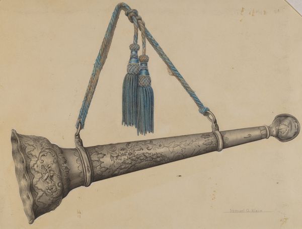 Curator: Let's discuss "Waffle Iron," a drawing created circa 1937 with pencil and colored pencil by Florence Stevenson. What's your initial take on it? Editor: It’s striking how ordinary yet almost monumental this kitchen utensil appears. The dark, mottled texture of the iron contrasts sharply with the light background, creating a sense of weight and presence. It's a humble object elevated. Curator: Indeed. Stevenson, who contributed to the Index of American Design, part of the WPA Federal Art Project, was tasked with documenting American decorative and folk arts. The choice of such a utilitarian object speaks volumes about the project's aims. Editor: Absolutely. Consider the era, the Great Depression. The WPA sought to valorize everyday American life. Rendering a waffle iron with such attention feels like a testament to the resilience and ingenuity of ordinary people making do with what they have. It transforms domestic labor into a subject worthy of artistic consideration. Curator: And it's more than just documentation; it’s interpretation. Look at the inclusion of precise measurements and technical diagrams alongside the rendering. It bridges the gap between art and industrial design, reflecting the era's fascination with both. Editor: I agree, it elevates a mundane object but there is a clear effort to apply this style to technical drafting to the same artistic goal of elevating mundane life. By merging artistic vision with precise measurements, she validates women's work. It is almost a subversive claim to legitimacy that celebrates practicality as a valid expression. Curator: Precisely. Furthermore, pieces created for the Index became accessible to museums, libraries, and schools. Through her meticulous hand, a piece of domestic life in the drawing like "Waffle Iron," became available and a valid topic of art for the masses. Editor: This work exemplifies how art can function as a tool for cultural preservation and social commentary. Curator: It does. Stevenson asks us to consider the politics embedded in our daily lives and what narratives are considered art, valuable, and valid. Editor: I find it truly remarkable how the careful representation of something so simple opens up so many avenues for contemplation.