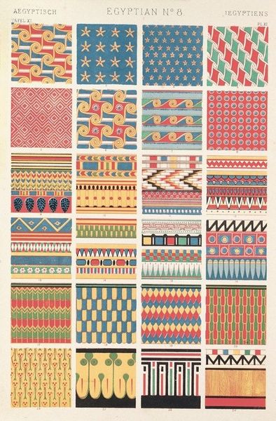 Owen Jones created this print, "Indian Ornament no. 7", showcasing ornaments from Indian wooden fabrics, embroidered textiles, and painted boxes displayed at the 1855 Paris exhibition. The print presents a series of ornamental bands, each a study in rhythm, balance, and Jones's grammar of ornament. Notice how each band is carefully structured, employing repeating motifs—floral, geometric, and abstract—to create a harmonious visual experience. The palette favours earthy tones—reds, greens, and blues—often set against contrasting backgrounds, enhancing the visual impact of the designs. Jones’s theoretical approach here is evident in the structured arrangement of the ornament. He aimed to uncover and codify the underlying principles of design, believing that good design adhered to universal laws of proportion, symmetry, and colour harmony. His work reflects an effort to extract the essence of Indian design and make it accessible for contemporary application. Jones invites us to see ornament not merely as surface decoration but as a structured system of visual communication.