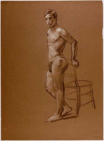 Editor: Here we have "Standing Sketch of Ginger" by Denman Waldo Ross, currently residing at the Harvard Art Museums. It's a striking sketch in dark hues, and I'm immediately struck by how the pose suggests both vulnerability and strength. What do you see in this piece? Curator: It whispers of a time when artists sought to capture the human form, not just as it is, but as a vessel of emotion, a temple of potential. There's a raw honesty here, isn't there? Almost as if Ross is inviting us into his studio, into the very act of creation. Editor: I hadn't considered it that way, more of an intimate glimpse rather than a formal study. Curator: Exactly! Perhaps Ross saw something of himself in Ginger, a fellow traveler on the path of self-discovery. It’s like a visual poem, isn’t it? Editor: I love that. A poem of self-discovery, still open to interpretation. Curator: Precisely. And isn’t that the joy of art?