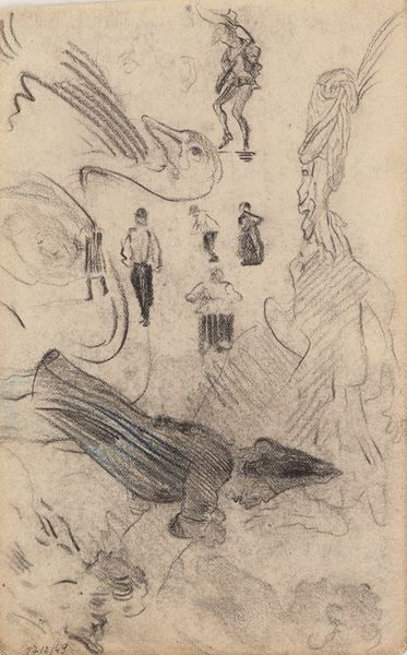 Curator: Let's examine "Sheet of Studies, Including a Roman Head, a Male Figure on a Pyre, and a Colonnade" by Luis Paret y Alcázar, created sometime between 1746 and 1799. It's currently housed at the Metropolitan Museum of Art. Editor: Immediately, I’m struck by the economy of line. It feels almost like note-taking, a very efficient use of space and material. What kind of ink was common then? Curator: We can see that drawings like this provided the visual vocabulary for history paintings at the time. Artists were greatly impacted and inspired by the renaissance movement. They really sought to connect political ideas to artistic renderings. Editor: And did Paret commonly work in ink? These skeletal drawings, you know, that process of putting ink to paper suggests immediacy, a direct transfer from thought to form. It implies accessibility. The cost of the material itself influences how it’s received. Curator: Absolutely, and these studies really acted as cultural conduits, transporting visual ideas, and then shaping broader artistic dialogues of the time. Look at that classical head at the bottom – the way it anchors the composition. It’s very telling to observe the process through which antiquity became a language through which society then spoke. Editor: Yes, that’s it: “spoke”. And it speaks materially, doesn't it? The relatively simple method emphasizes access to even lower ranking people; those of minimal wage could have picked up the trade to relay political messages in some fashion or another. Curator: That said, the drawings clearly showcase artistic talent. The arrangement suggests he may have been organizing his compositions ahead of realizing larger history paintings. But they also betray a degree of theatricality that one wouldn’t expect! The figure on the pyre is so melodramatic. Editor: Melodramatic, perhaps, but there's also something immediate in the sketch, something tactile about the raw material used to bring us a perspective into a performance of emotion as well as an accessible mode of documentation and production. Curator: A fine line that seems to anticipate many cultural forces that continue to shape society today. Thanks for helping draw it out. Editor: My pleasure. I walk away with a whole new appreciation for material accessibility!
