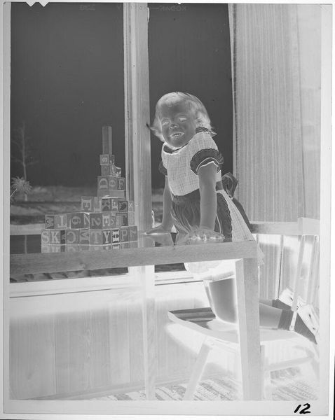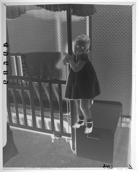 Editor: This photograph by Martin Schweig, simply titled 'Untitled,' depicts a baby eating in a highchair, the date is unknown, it's quite small, only about 4x5 inches. There's something haunting about the negative space. What symbols do you see resonating here? Curator: Indeed. The child, framed by domesticity, becomes an archetype of innocence and vulnerability. The highchair itself, a throne of sorts, symbolizes the structured environment we create for early development, doesn't it? Editor: I hadn't considered the highchair that way. So, the symbols reflect our hopes and anxieties about nurturing new life? Curator: Precisely. And what does the graham cracker symbolize? Perhaps a first taste of independence? Editor: Interesting, I didn't think about it. Now I see layers of cultural meaning I initially missed. Curator: Every image whispers stories of shared experience and cultural memory, if we listen closely.