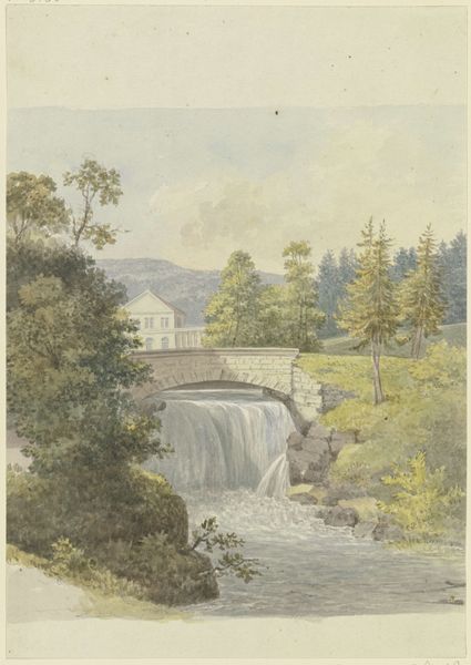 Editor: Here we have "Gezicht op de rivier van Kema, Waterhaalplaats" by Charles William Meredith van de Velde, dating sometime between 1838 and 1898. The trees surrounding the water's cascade create such a peaceful and still environment, and this feels more illustrative than artistic. What stands out to you? Curator: I am immediately drawn to how this image potentially romanticizes the colonial gaze. Water sources often became focal points of resource extraction and control, and landscapes such as these frequently justified intervention by outside entities. Do you think the tranquility you perceive could be a constructed narrative, obscuring a more complex relationship between colonizer and colonized regarding natural resources? Editor: That's interesting...I hadn’t considered the viewpoint of access and control. So the beautiful, serene environment actually served a purpose? Curator: Precisely! It raises the question: whose gaze are we adopting when viewing this piece? The composition itself, with its almost idealized depiction of nature, risks neutralizing the potential environmental impact or power dynamics inherent in resource management during the colonial era. The visual pleasure might distract us from critical interrogation. Editor: So we shouldn’t just take pretty picture for granted. Curator: Exactly. The “stillness” might also reflect an imposed stasis on the local population and their traditional interactions with the land. We need to consider whose stories are missing from this picturesque scene. Perhaps those most closely associated with this 'Waterhaalplaats?' Editor: That is insightful! I will definitely consider artwork with a more critical view. Curator: It is vital for decolonizing our approach to visual arts, viewing artworks as entry points into broader social and political dialogues rather than isolated aesthetic objects.