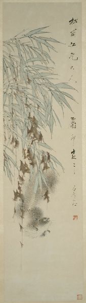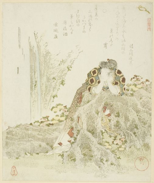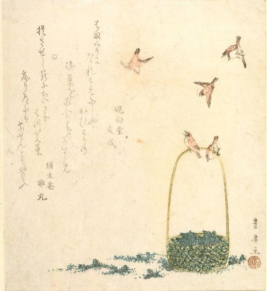 Editor: Here we have Kubo Shunman's "Peacock Feather and Plum Blossoms, with poem by Onoya Kuwayumi." The delicate lines and soft colors give it a dreamy quality. What stands out to you? Curator: Consider the materiality – paper, ink, brushstrokes. How does Shunman's choice of these readily available materials democratize the art form, moving away from precious, elite materials? It elevates everyday life to the level of art, blurring the lines between consumption and cultural value. Editor: That's a perspective I hadn't considered. Thanks! Curator: It highlights labor and the social context of artistic creation. What do you think about how the poem interacts with the imagery?