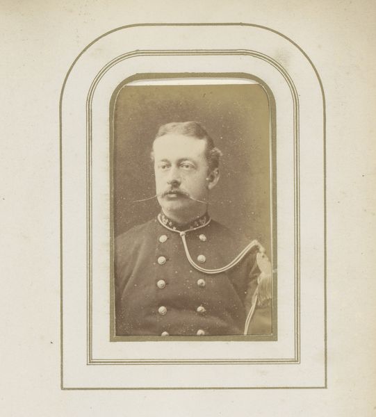 Curator: Here we see a portrait, captured between 1862 and 1863 by Maes & Michaux. It's a gelatin-silver print, titled "Portret van een man in uniform, staand bij een stoel met hoed," or, in English, "Portrait of a Man in Uniform, Standing by a Chair with Hat". Editor: Oh, he’s a striking fellow. There’s a solemn weight to him, don’t you think? Like he’s carrying the burden of something unspoken. Those medals, clustered on his chest, hint at a life of service, perhaps sacrifice. The sepia tones just add to that sense of gravitas. Curator: Absolutely. And that specific use of the gelatin-silver process allowed for finer detail, capturing not just the likeness, but also the texture of his uniform, the glint of those medals. Think of the cultural context: photography was becoming increasingly accessible, but studio portraits like these still held a certain status. It was about memorializing oneself and solidifying social standing. Editor: And yet, even within the constraints of a formal portrait, you catch glimpses of humanity. There’s a slight vulnerability in his eyes, almost as if he’s caught between duty and… something else entirely. Maybe that's just my imagination, reading into a historical document. The fact that the image captures every fine line and facial crease is a sign of a photographer focused on depicting reality instead of creating a perfect image, as some contemporaries preferred. Curator: Precisely. And when we analyze the materiality, consider the labor involved: preparing the gelatin emulsion, meticulously printing, and finishing the image. Photography in this era wasn’t a simple click; it involved skill and technical mastery. Editor: It’s amazing to think that such a small image could contain so many layers of history. I can't help but stare and imagine all the possibilities and events that had shaped him, made him who he was at that time. Curator: A convergence of chemistry, labor, and individual representation—quite remarkable. Editor: Makes you think, doesn’t it? Even portraits of soldiers, when done right, show them at their most human.