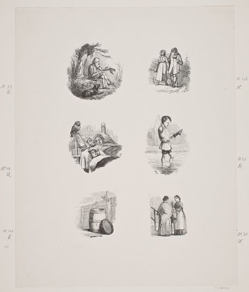 Dirk Jurriaan Sluyter created this print titled 'Vrouw met kind - Vrouw - Afscheid bij de gevangenis - De omhelzing' using an unspecified technique. The print is organized into four distinct scenes, each contained within rounded or arched frames, creating a structured, almost grid-like composition on the larger page. The scenes, rendered in monochrome, play with light and shadow to evoke different emotional states. The upper scenes are inverted, introducing a visual dissonance that challenges conventional viewing habits. This disorientation might reflect the emotional turmoil depicted in the scenes themselves – sorrow, farewell, and embrace. Sluyter uses strong contrast and detailed line work to convey texture and depth, from the fabric of the figures’ clothing to the architectural elements. The deliberate arrangement and inversion of scenes suggest a semiotic system at play, where each panel acts as a signifier. By disrupting the expected orientation, Sluyter encourages us to decode the underlying narrative and consider how form can influence our emotional and intellectual engagement with the artwork. The format invites continuous interpretation, reflecting how art engages with social discourse.