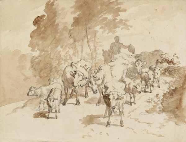 Editor: This delicate pen and pencil drawing, "Felshang, davor ein Pferd, dem ein Reiter aufsitzen will, am Boden zwei sitzende Figuren," its a mouthful I know, attributed to Johann Andreas Herrlein, feels like a fleeting glimpse into a traveller's rest. The figures seem paused, contemplative. What's your reading of this intimate scene? Curator: Ah, yes. It’s got that sketchbook intimacy, hasn't it? I love the ambiguity—a feeling of just catching this moment. It reminds me of Tiepolo’s landscapes, where figures and nature exist in this harmonious balance, tinged with gentle melancholy. But there's also something slightly unsettling to it. Look at the horse, burdened with baggage; the rider, struggling to mount. Perhaps this is not merely a rest, but a moment of frustrated ambition. Does the awkward positioning of the horse convey the psychological states of the sitters in your eyes too? Editor: I see that. It's like everyone is at an impasse, unsure of the next move. The figures blend with the landscape. Do you think that blurring intentional? Curator: Precisely. Consider how the ink bleeds and merges, almost obscuring the figures and horse into the rocks and foliage. I suspect that Herrlein aimed to explore the merging between the internal life and the external world, with Nature offering solace, or mirroring their struggles. I am reminded of how a distant melody sometimes merges into birdsong, echoing our emotional landscape in subtle, almost indistinguishable, ways. It creates a sense of unresolved longing, don’t you think? Editor: It does. The blurring adds to that. I hadn't quite grasped how intentional that effect might be. Thanks, that’s given me a whole new appreciation for what's going on in this deceptively simple drawing. Curator: My pleasure. It's drawings like these, where the artist captures the transient moments, leaving us to complete the story, that I find most fascinating. It reminds me that the real masterpiece lies not in the completed image, but in the whisper it leaves in our minds.