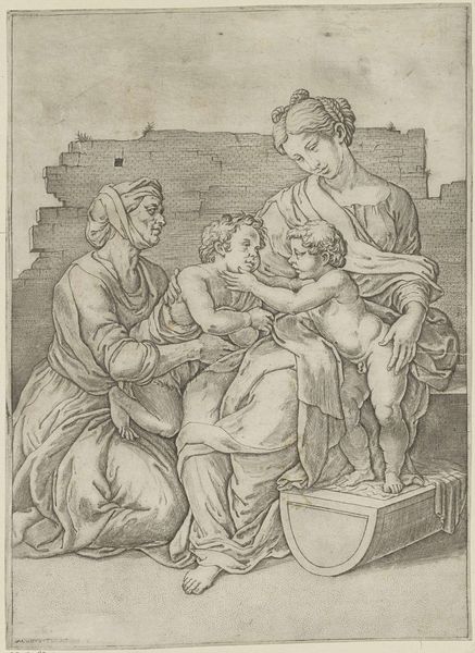 Editor: Caraglio’s engraving, “Holy Family with the Cradle,” depicts a tender family moment. The level of detail achieved through the engraving process is remarkable. How would you interpret the work? Curator: The engraving process itself is key. Consider the labor involved, the tools used, and the reproducibility of the image. This challenges notions of artistic uniqueness, making religious iconography more accessible through wider circulation. Notice how the stark contrast emphasizes the physicality of the figures, highlighting the material reality of the holy family. Editor: That’s fascinating. So, the value lies in the reproduction and distribution of the image? Curator: Precisely. The print becomes a commodity, circulating within a specific socio-economic context, impacting religious consumption and dissemination of ideas. The material tells a story of production and reach. Editor: I never considered the social impact of the artistic process itself before. Thank you!