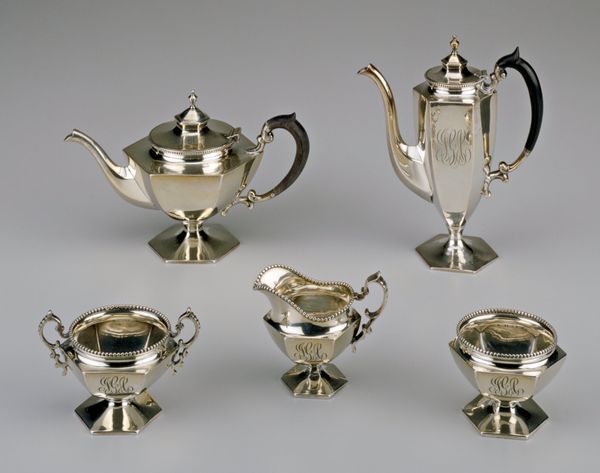 Editor: Here we have a pair of silver sauce boats, possibly from England, by Sir William Chambers. The date is unknown, but they have a lovely Rococo style. I'm struck by how symmetrical they are, and by the curvilinear forms. How do you interpret their design? Curator: The objects command attention, do they not? Let us focus on the forms themselves. Consider the mirroring, the repetitive curves in the handles and base. Are we seeing simply ornamentation, or can the pattern invite our sight to experience balance? How might semiotics further interpret the meaning and messaging that the shape brings? Editor: That's fascinating. So you are looking at the design elements to explain how it's pleasing to look at, rather than focusing on its utility? Curator: Utility is not negated, but subservient. The craftsmanship here focuses not only function but also composition. Take the garland swags. Their presence encourages you to inspect the quality, creating rhythm as your gaze bounces. Editor: It’s a far cry from some of the starker, more utilitarian designs of today, even for serving dishes. The visual weight given to its form is impressive. Curator: Exactly. Observe how that tension, between pure form and everyday usage, defines its nature. Are there forms that it reminds you of in the natural world? Editor: Now that you mention it, the curled handles look a bit like breaking waves or stylized leaves, somehow frozen in silver. Thank you for showing how the eye can interpret this work's semiotic dimensions, as well as its pleasing symmetrical aspects. Curator: A deeper inspection yields many new revelations about the skill of the creator. I, also, have benefited from this conversation.