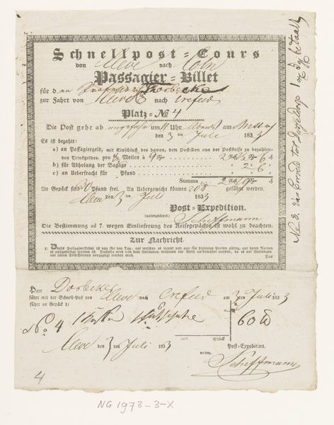 Curator: What immediately strikes me is the intimacy of this work, its vulnerability as a personal record. The ink on paper—presumably a drawing or sketch dating from around 1720 to 1729 and titled "Inschrijvingsbiljet van Jacob Schalcken," or "Registration Form of Jacob Schalcken"—reveals a bureaucratic, almost transactional interaction rendered in delicate detail. Editor: Yes, that’s intriguing. But there is something about this small slip of paper, adorned with the visual shorthand of bureaucracy—the formal script, the company seal—that hints at larger structures of power and the role Schalcken, the artist, played within those. The very act of registration, of inscribing oneself, always situates the individual within a socio-political context. Curator: Absolutely. We see Baroque stylistic elements subtly embedded, reflecting the societal emphasis on ornamentation, presentation, and perhaps even a self-conscious performance of identity. I’m also interested in the heraldic imagery up top. Crests carry significant weight; what does that signify to the individual’s role and responsibility within their city, guild, or society? Editor: That heraldic crest is key! It implies privilege, belonging to an elite, and benefiting from the mechanisms of that system. The financial undertones, with mention of "gulden" and shares, further situate Schalcken's subjectivity in relation to commerce and perhaps to a burgeoning capitalist class. This is not a neutral transaction, but rather participation within a financial ecosystem that holds many potential implications, don't you think? Curator: I concur. Even in something as seemingly mundane as a registration form, Baroque symbolism elevates the everyday, transforming a simple piece of paper into a layered tableau of societal values and identity performance. Editor: Exactly, which ultimately offers an intriguing tension between individual agency and structural conformity, the traces of which endure today. The artwork quietly yet pointedly prompts consideration of our historical inheritances within economic systems, particularly within class and power structures. Curator: It's like uncovering the psychological footprint of the Baroque era through the lens of a document. Its simplicity belies the complexity it represents. I appreciate seeing it differently now! Editor: And for me, it serves as a subtle reminder that even routine forms carry historical meaning relevant to critical evaluations about inclusion, privilege, and power that speak to a contemporary social justice agenda.
