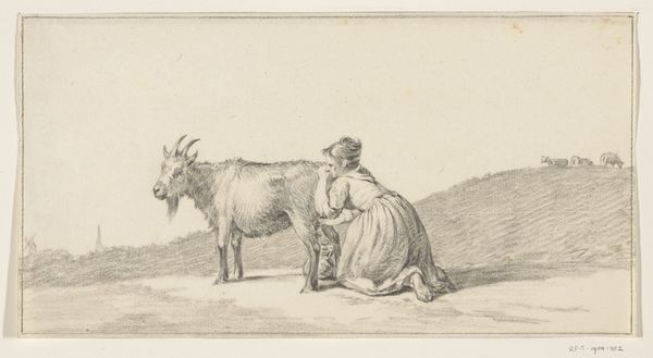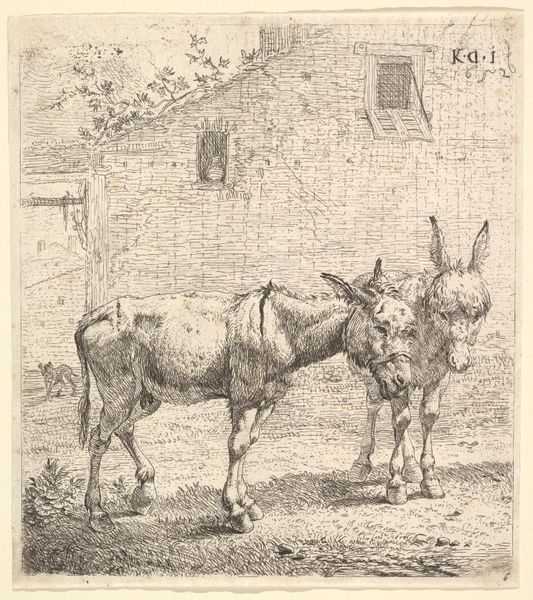 Editor: Here we have "Seated Shepherdess with Cow, Goat, and Ram" by Johann Heinrich Roos, dating somewhere between 1641 and 1685. It's an etching, currently housed in the Rijksmuseum. The details are incredibly fine; you can almost feel the texture of the stone wall. What do you make of it? Curator: I find this work fascinating when considered through a materialist lens. Roos's choice of etching—a process reliant on acid, metal plates, and intense labor—speaks volumes. The very *making* of the image underscores the socioeconomic context of its production and consumption. Think about the time, resources, and skill needed to create this plate. Editor: So you're saying the *process* is as important as what's depicted? Curator: Absolutely. Roos isn’t just showing us a pastoral scene. He's revealing a relationship with the viewer built upon a hierarchy of making, and ownership of that process. This was likely a luxury item for a discerning collector, showing an appreciation of landscape while removed from it, purchased from those very means it seeks to idyllicize. Consider the materiality—the paper, the ink—as commodities. Editor: I never thought about an etching in terms of commodity before! I tend to get wrapped up in just admiring the image itself, not the means of making it, and those social aspects involved. Curator: Exactly. We can ask, how does the print medium itself shape our understanding of labor and leisure here? Does the detailed execution legitimize or romanticize this view of country life and animal husbandry? Where do these animals eventually *end* up in the chain of labor, material, and production? Editor: It certainly gives me a lot to consider. Thanks for highlighting the role of material processes in appreciating this pastoral scene. Curator: My pleasure. Always look closely at *how* art is made – it re contextualizes our understanding.