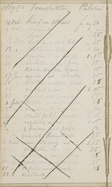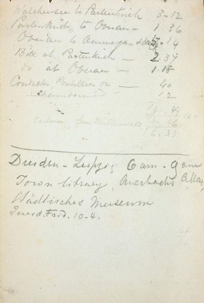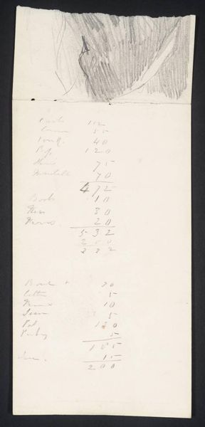 Curator: This page, titled "Afmetingen van kamers," or "Dimensions of Rooms," comes to us from the sketchbook of Willem Koekkoek, likely spanning the years 1849 to 1895. It's currently held here at the Rijksmuseum. My immediate impression is of a rather unassuming object. It feels almost…private. Editor: The paper, aged and textured, hints at a life lived alongside its creator. The grey of the handwritten entries contrast with the off-white, hinting at a simple process of notation using perhaps a simple stylus or early graphite pencil, almost devoid of decoration. Curator: Indeed. It’s the intimate scale and personal nature of the hand-lettering that I find compelling. The varying script styles, some words underlined for emphasis, reveals not just measurements, but a specific intention in the recording. Observe how some entries fade, suggesting revisions or the passage of time impacting the inscription itself. It is self-referential as text. Editor: Right. These notations, “hoog” – height – “bred” – width – it's fascinating to see a direct record of the labor involved in the making or planning of architectural space, made more potent due to the time elapsed, creating an unintentionally expressive surface. It provides a tangible connection to the historical material conditions. It's not about the ideal space, but its factual construction. Curator: Absolutely. Furthermore, consider how these aren’t just simple measurements but function almost as coordinates within a life’s artistic pursuit. There’s a harmony to the composition – the numerical and linguistic scripts interwoven creating a balance upon the paper surface. Editor: I find myself considering the unseen hands shaping the world this page describes; the skilled labor hidden behind seemingly simple construction, but that labor created the literal foundations of human existence: home. It grounds the sublime into something very, very pragmatic and connected to working realities. Curator: That's an important element: the transformation from simple utility to considered aesthetics, achieved not through ornamentation, but sheer honesty and raw use within daily applications. Editor: Exactly. I am still struck by the beauty found in its very transience of both process and intent – a quiet memorial to how something is made, materially and through physical application and engagement. Curator: Well, I am drawn by the intimate peek into the hand of the artist thinking and creating space, that speaks powerfully across the decades since it was put on paper.
