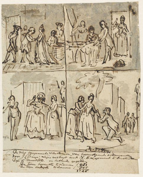 Editor: Here we have "Nations of America ballets," a 17th-century drawing currently held at the Metropolitan Museum of Art. It’s fascinating seeing these figures depicted in such stark, almost scientific detail. What jumps out to you about this print? Curator: Immediately, I'm struck by the representation of "America" within a European context. We have to ask, what narrative is being constructed here? What power dynamics are at play when "nations" are presented as staged performances? Editor: So it's not simply documentation, but an active interpretation? Curator: Precisely. Look at the costumes, the poses. They're not neutral observations, but deliberate constructions intended for a specific audience. The print attempts to classify and contain these “nations,” likely reflecting colonialist attitudes. What does it mean to present different cultures as essentially balletic spectacles? Editor: I see your point. It almost dehumanizes the people being represented. They are like exotic curiosities. The second ballet features individuals wielding bows and arrows, whilst the first showcases figures with pickaxes, reflecting stereotypical or functional associations? Curator: Exactly. It reduces complex cultures to simple, easily digestible images. And what is omitted is just as important. Where are the Indigenous voices? Who gets to control the narrative? It raises serious questions about cultural appropriation and misrepresentation. What lasting effects might stem from such visuals? Editor: Thinking about it that way, this Baroque print prompts us to consider who is given the authority to represent other cultures and to question those portrayals, right? Curator: Absolutely. Art isn’t created in a vacuum. By interrogating historical pieces, we gain valuable insight into ongoing struggles with representation, power, and cultural understanding. Editor: Thank you! It really gave me a new understanding of prints within a historicized narrative and post-colonial mindset.