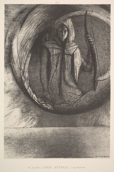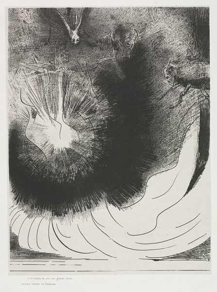 Carl Hoeckner's lithograph, "A Vision," presents a stark, monochromatic landscape filled with ambiguous figures and forms. The composition is dominated by swirling patterns and contrasting textures, creating an unsettling visual experience. The dark figures appear to be caught in a vortex, their forms distorted and elongated. Lines jut across the space, connecting disparate elements and suggesting a network of unseen forces. The eye is drawn to the centre, where a dark orb hangs suspended, acting as both a focal point and a void. Hoeckner's use of lithography allows for a rich range of tonal variations, enhancing the dreamlike quality of the image. The lack of clear spatial relationships further destabilizes our understanding of the scene. The swirling, chaotic composition could be interpreted through the lens of post-structuralist thought, where fixed meanings are challenged and the viewer is left to grapple with multiple, often contradictory, interpretations. "A Vision" thus becomes a site of ongoing interpretation, reflecting the instability of meaning itself.