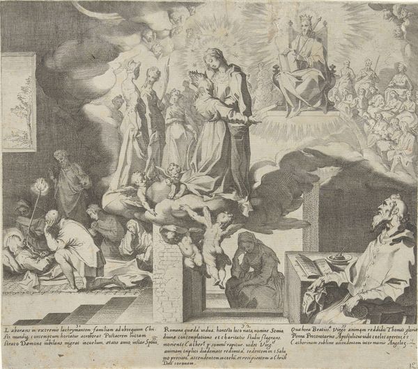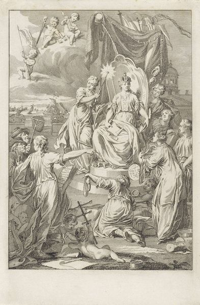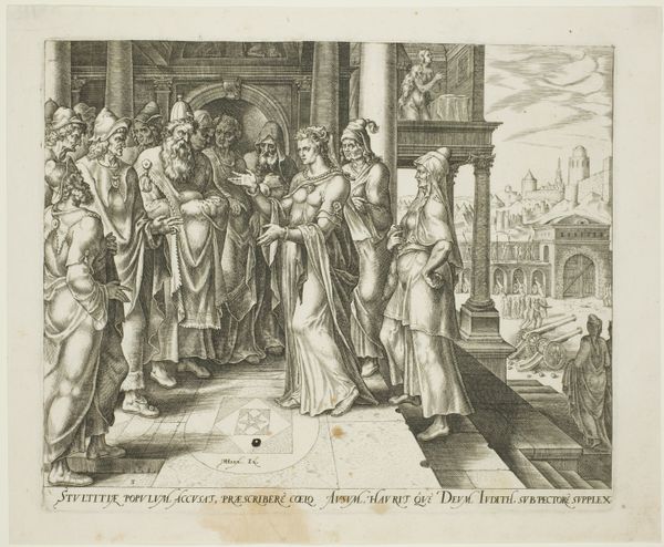 This engraving, titled "Lot verlaat Sodom", presents us with a scene of biblical exodus rendered through a structured composition. The monochromatic palette emphasizes form and texture. The arrangement directs our gaze from the left, where an angel pulls Lot and his daughters away from the doomed city, towards the figures on the right, Lot's wife and daughters, each delineated with precise lines and shading. The artist uses scale and proportion to distinguish between the divine and the mortal. The angel's towering presence juxtaposed with the city’s destruction signifies a break from worldly existence and a turn towards spiritual salvation. The angel’s gesture is decisive and forceful, contrasting with the expressions of anguish and uncertainty worn by Lot's family. The classical lines of the architecture on the right ground the composition and provide a stable framework for this depiction of chaos and divine intervention. Through this structured arrangement, the artwork challenges fixed meanings, prompting a reevaluation of faith, obedience, and the consequences of defiance.