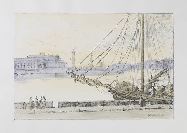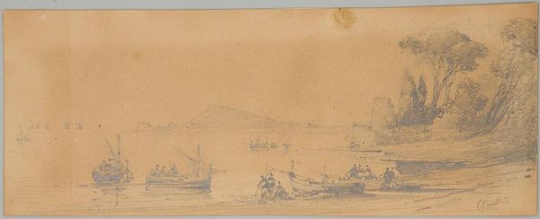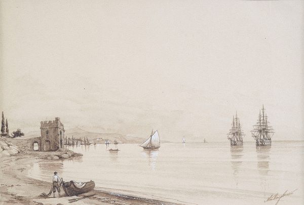 Curator: Let's delve into this serene, almost ethereal rendering titled "View of Mount Vesuvius," created circa 19th century by Giuseppe Canella, currently residing here at the Minneapolis Institute of Art. What strikes you immediately? Editor: The pervasive gray. It dominates everything, muting the energy I expect from a port city overlooked by a volcano. What historical tensions might be lingering beneath this apparent tranquility? Curator: Canella certainly wasn’t after pure topographical accuracy. Observe his methods. Predominantly watercolor and drawing techniques en plein-air; quickly capturing the atmosphere rather than meticulously documenting every detail. Note, too, that although labeled a drawing it evokes painting through thin washes. Editor: Precisely! And it raises questions about the intended audience. Was it produced for private collectors? What narratives did it feed, especially relating to European colonialism and travel, showing people sailing idly past with no visible production taking place. Whose labor literally carries them? Curator: A crucial observation. I do find the very materials tell an intriguing story, speaking to Romantic ideals of nature’s sublime power through a quite refined artistic execution. I imagine this would've appealed to a wealthy audience wanting souvenirs of their grand tour of Europe. Editor: A souvenir perhaps veiling harsher truths about the period. We are forced to look beyond the surface and consider what is being elided. The economic structures supporting this apparent idyll must also be interrogated to complete the understanding of it. Curator: Indeed, and this perspective adds such necessary depth to appreciate the whole work. Thinking of the artist’s possible process informs so much, too: the blending of plein air studies to communicate this singular perspective. Editor: Thinking of all these perspectives, I am also left wondering how its presentation in the museum influences reception of Canella’s "View of Mount Vesuvius," and its cultural impact on perceptions surrounding Italy. Curator: A museum setting does indeed inevitably shape interpretation. For me, this careful view encapsulates so much of nineteenth-century visual strategy as seen through travel’s commodified lens, a tangible document of artistic process and patronage, Editor: Agreed, while acknowledging art’s entanglement within societal frameworks will surely enhance visitors' encounters, turning aesthetic enjoyment into thoughtful critique.