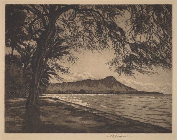Curator: Frederic Edwin Church’s "Mount Katahdin from Lake Millinocket," painted in 1878, offers a striking view. The location is Maine, and he's rendered it in watercolor and oil on paper. What’s your initial impression? Editor: The composition immediately strikes me as serene, almost ethereal. There’s a stillness to the water and a gentle light bathing the mountain that evokes a sense of quiet awe. The chromatic values seem quite muted, reinforcing this calm, restful sensibility. Curator: I concur on the painting’s formal structure supporting a calm sensibility. Notice Church's use of layering and subtle tonal variations, the way the atmospheric perspective renders Katahdin in almost ghostly terms. He is clearly interested in manipulating visual perspective using a romantic, almost symbolic approach to the pictorial surface. Editor: Yes, that spectral effect absolutely links to Church’s broader role in cultivating a taste for landscape as sublime national allegory. After the Civil War, paintings of unspoiled wilderness performed ideological work. Promoting nature becomes a symbol of a country being reformed, revitalized. Church explicitly invites a comparison between the "sublime" in nature and an exceptional, if somewhat invented, national identity. Curator: He uses luminist strategies for the symbolic dimensions, doesn’t he? Take, for instance, the hazy sunlight and precise linear elements. Light itself becomes the subject. Consider the composition— the horizon, the shape of Katahdin, the color temperatures of foreground and background all contributing to an internal harmony, a stable pictorial unity and thus supporting the symbolic reading you outline. Editor: Church's commercial strategy further reveals how American Romanticism supported expansionist imperatives. Prints after paintings like these were widely circulated, attracting tourists, settlers, and industry to places like Maine. Manifest Destiny manifests again! Curator: An insightful socio-economic assessment to augment the image’s formal construction, and, moreover, its atmospheric manipulation, which points us toward understanding its continued appeal in contemporary aesthetic regimes. Editor: Well, I'm grateful for this opportunity to connect these dots together!