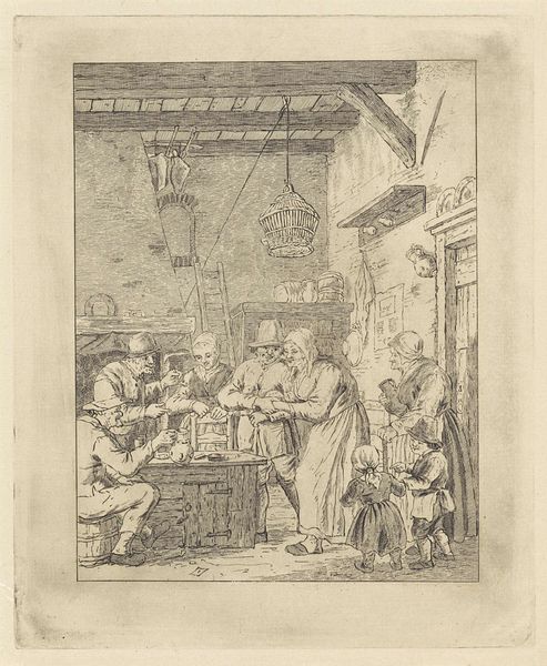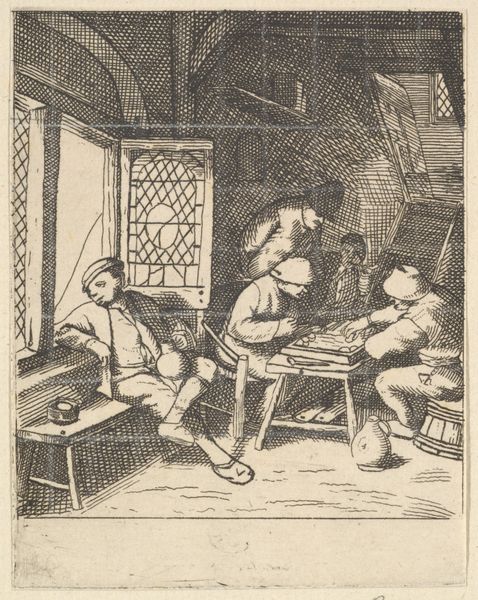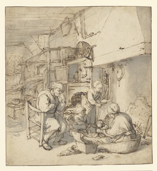 Curator: This drawing, "Interior of a Peasant Inn with Smoking and Drinking Figures," attributed to Cornelis Dusart and dated sometime between 1670 and 1704, offers a glimpse into everyday life during the Dutch Golden Age. It's rendered in pen and ink, giving it a lively, almost sketch-like quality. Editor: It feels intimate, but also… grimy? The atmosphere is palpable; I can almost smell the stale beer and pipe tobacco. The contrast between light and shadow emphasizes the figures huddled together, creating a sense of enclosed community. Curator: Precisely! The medium, pen and ink, facilitates the efficient and economical reproduction of images, thus reaching a wide audience of potential buyers within a developing and competitive art market of the time. The cross-hatching, especially, allows for subtle gradations that mimic tonal effects usually achieved with chalk or washes. Editor: And what's striking is how the figures seem almost suspended between states of activity and inertia. Notice how much material and process are brought forth: the lines aren't about flawless representation. Instead, the scratchy quality gives us insight into labor that makes it real. The hunched postures, the blurred edges, all suggesting a casualness. This piece gives attention to social documentation more than technical finesse. Curator: The inn itself, a focal point of social life, played a crucial role in disseminating information and solidifying communal bonds. Depictions like these reinforced the idea of shared cultural experiences within Dutch society. We observe this sense of 'gezelligheid', or coziness and camaraderie that were central to Dutch identity at the time. Consider also the political subtext: were these merely genre scenes or subtle commentaries on social behavior? Editor: Well, and who exactly commissioned and then consumed these kinds of images? It tells a story of artistic accessibility and affordability; unlike grand oil paintings commissioned by the wealthy elite, smaller ink drawings circulated through a more varied network. I wonder what the laborers themselves made of seeing their likeness circulated? What did it do to their identity? Curator: Dusart provides us with an invaluable window into the world of everyday Dutch life. The artistic method is also an insight: by looking at its strokes, we appreciate the time and culture involved with it, while thinking of it less as simply an aesthetic piece, and rather something deeper with meaning to pull out and digest. Editor: I agree. It's in its material simplicity, that this pen-and-ink work gains profound resonance, echoing conversations, laughter, and quiet moments of contemplation.