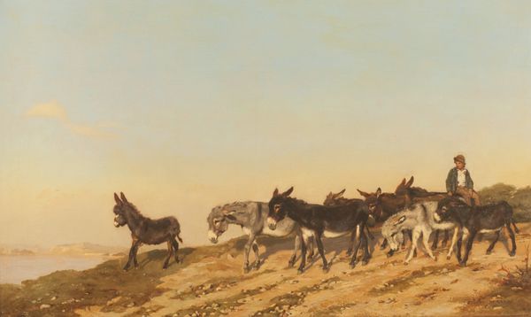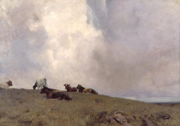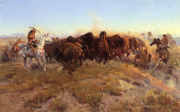 Editor: Albert Bierstadt's "The Wild West" presents a vast, sweeping landscape rendered in oil paint, featuring cowboys on horseback hunting buffalo. The scene has an element of both beauty and tragedy. What strikes me is how it seems to glorify this hunting practice, even though it clearly contributes to the decimation of these animals. What do you see in this piece from your perspective? Curator: It's impossible to view this painting outside the socio-political context of Manifest Destiny and westward expansion. The Hudson River School, to which Bierstadt belonged, often romanticized the American landscape, but that romanticism served a very specific purpose. It legitimized colonial projects by depicting the West as a limitless resource, implicitly encouraging settlement and exploitation, while obscuring Indigenous presence and perspectives. The depiction of the hunt isn't just about the thrill, it is directly connected with government policies of westward expansion, economic enterprise, and systemic violence that reshaped the continent, often sanctioned through artwork of this type. Do you think the vastness of the land is an innocent aspect of the piece, or does that vastness perform a role, too? Editor: I think that scale is intentional now that you mention it, contributing to that sense of limitlessness. I suppose the composition serves to justify expansion by suggesting an endless bounty free for the taking by those who dare. But it also feels tragic. Is it possible that Bierstadt might have had conflicting feelings? Curator: That is a very insightful question, and highlights the complexity inherent within these works. Some argue that the very act of documenting these landscapes suggests an awareness of their vulnerability, a fear of their impending disappearance through settlement. Perhaps Bierstadt wanted to capture a vanishing way of life even as he celebrated the triumph of settlers over nature, framing what we now see was a planned act of ecological damage, social control, and land repossession. Editor: That’s a really interesting point – the act of painting becoming a kind of complicated, perhaps even subconscious, act of documentation. Curator: Exactly. It pushes us to question what’s being framed and what is consciously – or unconsciously – omitted within cultural representations.