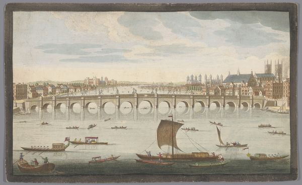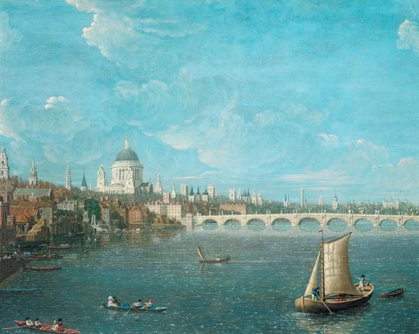 Editor: So, this is Fyodor Alekseyev’s “View of the Kremlin and the Kamenny Bridge in Moscow,” an oil painting. I’m struck by how…stately it is, but also very serene, despite all the detail. It’s almost like a postcard. What do you see in this piece? Curator: The symbols here tell a rich story. The Kremlin itself, rendered with such precision, functions as more than just architecture; it embodies centuries of Russian power and identity. Consider its visual weight in relation to the figures along the river. How does Alekseyev position them? Editor: They're tiny in comparison! Almost incidental. Curator: Exactly. And the bridge? It represents connection, but also dominion. Who crosses, and why? How might the act of crossing, in Alekseyev's time, speak to aspirations for the future while honoring a deeply felt past? What emotional associations did such sites possess for its original viewers? Editor: So, it's not just a nice view, it's loaded with meaning for the Russian people. The figures and the Kremlin seem to evoke both a sense of grandeur, and one of the everyday… Curator: Indeed! Notice too how the artist emphasizes certain elements with light, guiding our eye. Light can represent enlightenment, or divine favour. Ask yourself what repeated visual or thematic motifs bind all sections together into an overall message! Editor: It’s fascinating to consider how something that looks so straightforward is actually packed with cultural and historical information. I never thought of a landscape as a carrier of cultural memory in this way. Curator: It’s like a visual encyclopedia. These images echo through generations. Consider how potent they are as vessels for cultural continuity. I am not sure I’ll ever look at landscape paintings the same way again!