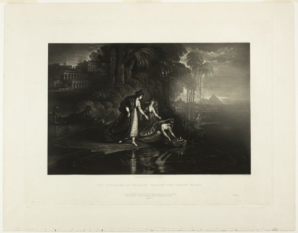 Curator: This print is entitled “The Fall of Babylon,” and it comes from John Martin’s series of “Illustrations of the Bible” from 1835. It's a charcoal drawing and engraving on paper, currently residing here at the Art Institute of Chicago. Editor: Wow, there’s such a powerful, overwhelming sense of dread here. The figures in the foreground seem lost and grief-stricken while this immense city burns in the background. It evokes themes of colonialism and the human cost of progress. Curator: Indeed. Martin was a master of the dramatic and the sublime. In this piece, he translates a biblical narrative into a spectacle of ruin, very much aligned with the Romantic period’s fascination with grand historical events and the power of nature. This was made during the peak of the British Empire. It suggests questions of the impermanence of empires. Editor: And the choice of charcoal emphasizes the somber tone. It almost feels apocalyptic, that intense contrast between light and shadow, mirroring the collapse of civilization and moral order. I read a potent allegory about systemic injustice and the consequences of unchecked power. Curator: Consider the cultural context in which this image circulated: Religious fervor was intertwined with ideas about social justice. Martin wasn't just illustrating a biblical story; he was offering a commentary on the social issues of his time and a stark warning. The scale alone implies authority and an admonition to any nation at risk of decline. Editor: This visual language connects strongly with contemporary discussions about ecological disaster, inequality, and political upheaval. The vulnerable people represented stand out more than the architecture. What will happen to them after the “fall?” How do systems of power create, ignore, and even exacerbate human suffering? Curator: Precisely. Martin capitalizes on the popular fascination with historical and biblical narratives, which had huge markets in England, Europe, and America. Images such as these, circulated as prints, helped to frame discussions of history, religion, and empire-building in popular imagination. Editor: It speaks to the cyclical nature of history and the persistent struggle for justice, asking us to reflect on our own societies. The burning city could be any number of places today, still consumed by corruption and violence. Curator: Viewing this work through a modern lens helps us engage with its continuing resonance in the face of ever-shifting cultural landscapes. Editor: Yes, reflecting on the impact and what such powerful imagery inspires within each of us, individually and collectively.