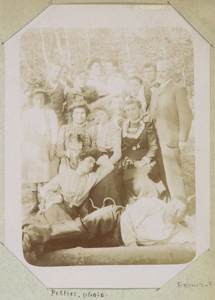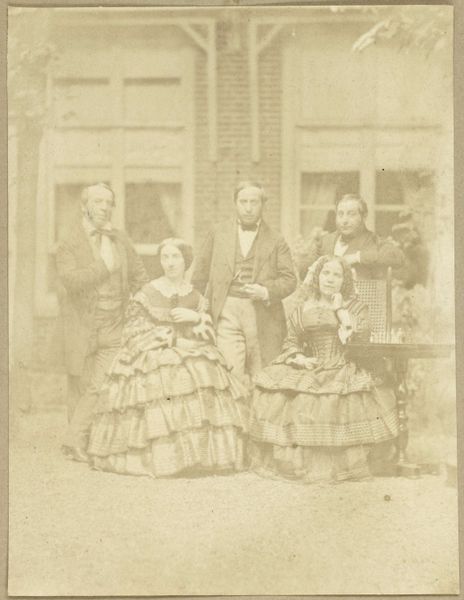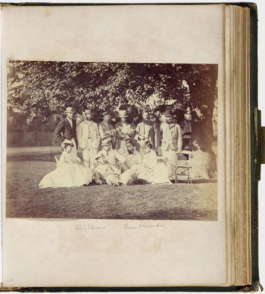 Editor: This albumen print, "[Elegant Group Outdoors]" by Horatio Ross, made between 1856 and 1859, is quite striking! It almost feels like a tableau vivant. What aspects of this photograph stand out to you? Curator: The composition definitely evokes a staged quality, doesn’t it? Think about the social dynamics at play here. Photography in this period wasn't just about capturing an image; it was about projecting status and conforming to very strict codes of representation. Who do you think had the power in this group, and how is that power visually expressed? Editor: The men, probably? Their height and formal dress stand out, versus, say, the women’s elaborate dresses, which almost seem to blend them into the landscape. Curator: Precisely! Consider how this photo might reflect broader Victorian anxieties about gender roles and class. The landscape, while seemingly "plein-air," is actually a carefully constructed backdrop that mirrors their social standing. Do you see the constraints they operate within, masked by this presentation of elegant leisure? Editor: That makes sense. I guess I hadn’t considered the way even an outdoor shot can be so controlled and posed to convey a certain social message. Curator: It’s a powerful reminder that even the most seemingly "natural" images are carefully constructed representations. What has this shifted for you, considering the photographer's perspective, and how that interfaces with their subjects? Editor: Definitely made me more aware of the power dynamics embedded in photographic portraits of the time, and maybe even now!