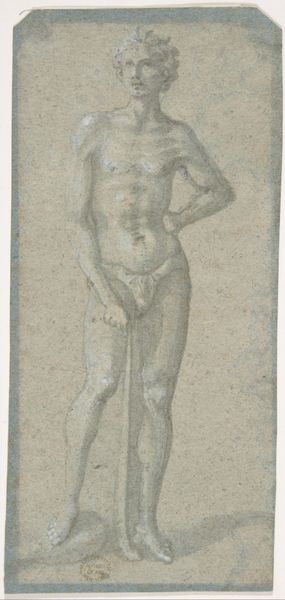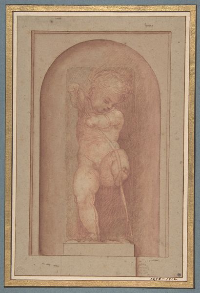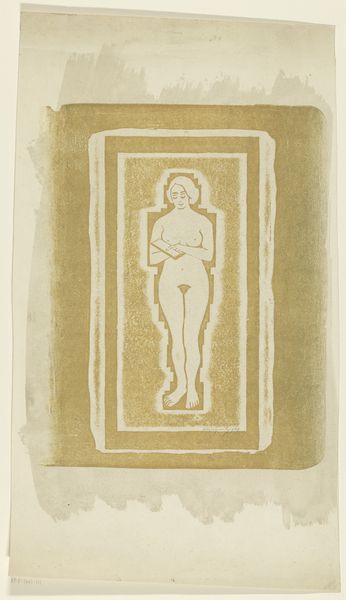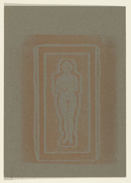 Curator: There’s a quiet solemnity to this etching. What do you sense in it? Editor: Immediately, a kind of muted tension, the image is soft but firm and present at the same time. Perhaps it is the combination of geometric shapes enclosing the vulnerable figure that projects this sense. The print's color lends a delicate but old effect as well. Curator: The piece, made in 1924 by Samuel Jessurun de Mesquita, is titled "Naakt met boek of stenen plaat in de hand"—"Nude with book or stone tablet in hand." It’s an etching on paper currently held here at the Rijksmuseum. Let’s dive a bit deeper into the visual vocabulary. The figure itself, seemingly suspended, recalls classical depictions of the female form while simultaneously appearing contained and restricted. How might this framing alter our understanding? Editor: That framing—those rigidly geometric borders surrounding the soft human figure—it’s creating a stark contrast. Is it symbolic of the constraints imposed on women, or a meditation on visibility versus objectification during that interwar period? It reflects this precise tension: the expectation to embody an ideal juxtaposed with limited social, economic, or political agency. Curator: Exactly. And notice how she's holding that book, or stone tablet. A source of knowledge, perhaps law? What narratives are coded in such gestures? It seems to signify the burdens of education or imposed morality. Is there even agency present? Her eyes are looking downward and seem detached, hinting at resignation. Editor: Yes, and it brings questions regarding the female body and access to traditionally masculine or patriarchal spheres such as intellectual and cultural institutions. It makes me think about societal expectations put upon people in those settings and during those years. Curator: I read something about the image as an echo, maybe a lament. But do you think we are imbuing it with too much? Maybe the figure is meant to simply show how people carried burdens regardless of background and expectations? I see how cultural context might overdetermine how we read that female figure as passive or oppressed. Perhaps she simply transcends those categories. Editor: It's always a balance, isn't it, when exploring such powerful imagery, to consider the multitude of interpretations across history and how they speak to contemporary issues. There’s no one way to view such complexities. Curator: Precisely, it prompts questions about tradition, and freedom, knowledge and captivity, opening multiple perspectives and highlighting contradictions still resonant today. Editor: Indeed. This small work surely does open expansive narratives on societal impositions, representation, and identity.