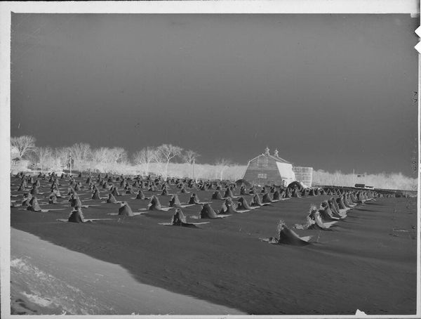 Editor: This arresting gelatin silver print, "Untitled (large turkey farm)" by Lucian and Mary Brown, depicts a dense gathering of turkeys under what appears to be a long shed. The sheer number of birds is striking. What can we say about the means of production in a piece like this? Curator: The photographic process itself becomes a means of documenting industrial scale food production. Consider the labor involved in raising so many animals and how that's translated into this small format image. Does this image prompt you to think about the system of consumption it supports? Editor: It definitely does. Seeing them like this, it's hard not to think about where they're going. I hadn't considered the photograph itself as part of that system. Curator: Precisely. And by focusing on the material conditions – the farm, the photographic materials, the audience – we can uncover a layered understanding of the work. Editor: That's a perspective shift for me. Thanks! Curator: My pleasure. It's all about looking beyond the surface.