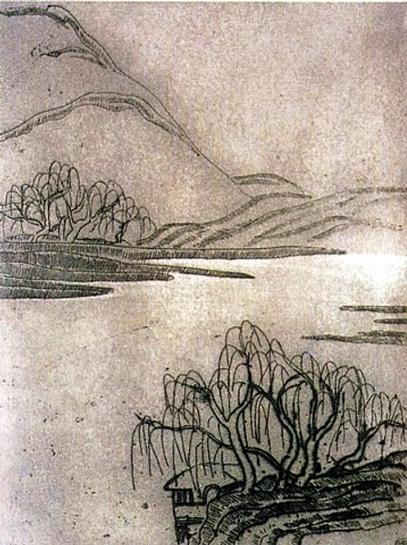 Editor: Here we have Qiu Ying's ink and color on paper work, "Fisherman Hermit." The golden hue and vastness give it a serene, almost dreamlike quality. What’s your interpretation of this piece? Curator: What I see is a potent articulation of literati values, especially considering Qiu Ying’s unusual position as a professional painter. Think about it – the literati ideal promoted distancing oneself from courtly corruption in favor of simple living. The Fisherman Hermit embodies this. Editor: So, the fisherman represents more than just a simple laborer? Curator: Precisely. The figure embodies an intentional withdrawal from society. Consider the deliberate contrast between the detailed foreground, depicting human habitation and activity, and the expansive, less defined mountains and water behind. Where does your eye linger? Editor: Definitely on the foreground with the house and figures… but there's something alluring about the distant mountains. Curator: And why do you think that is? The artist prompts you to examine these opposing forces. On one hand, the idealized escape into nature but, simultaneously, you’re being drawn back to this very specific scene, which might be a longing or an unattainable desire. Does this image romanticize that escape or subtly critique its inaccessibility? Editor: That’s a complex point, the romanticization versus inaccessibility of escape...I hadn't considered that. Curator: Well, I'm glad we opened it up together. Perhaps viewers will carry forward these considerations too.