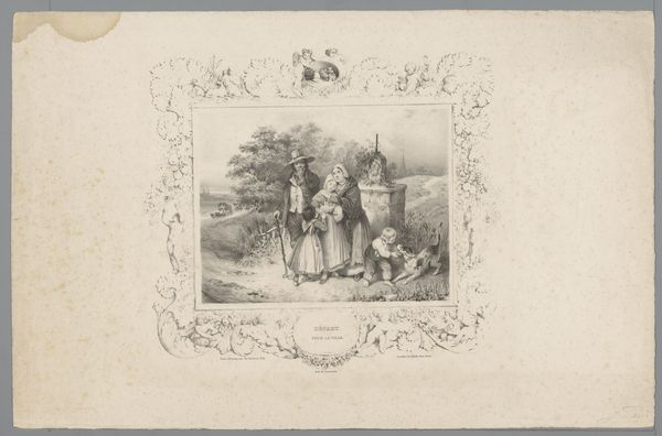 Achille Girardot made this print titled "Opprobre / Dwangarbeid / 40 ans" using etching, a process that requires tremendous skill and exacting labor. The image depicts men in what appears to be a naval setting, performing hard labor. Their bodies are stooped and strained as they work, the weight of their labor evident in their posture. Consider the etcher's work too. Lines and shading build the image in great detail, demanding attention from both the artist and the viewer. The print also has a decorative border with foliage and birds. The text below the main image translates roughly as: ‘My life long, a slave’s complaint, I have not deserved it’. Girardot is drawing attention to labor, class, and the social conditions of his time. This artwork transcends traditional distinctions between high art and craft, inviting us to consider the social context and the amount of work involved in the production process.