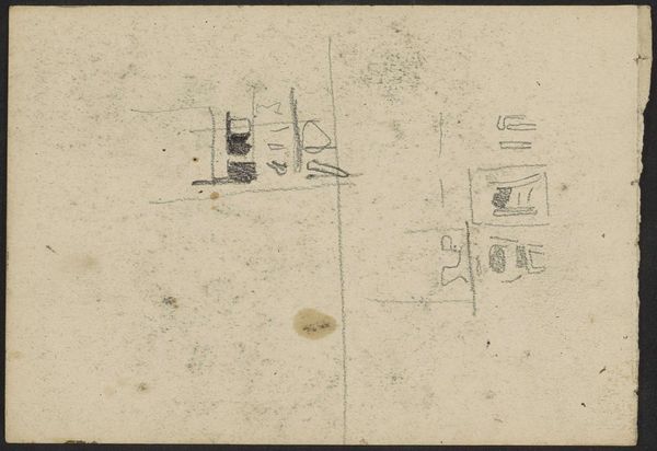 Curator: It's tempting to see an echo of Zen Buddhism in the deliberate use of negative space in this impressionistic landscape. Editor: It looks like the artist just started sketching and then...stopped? Did he forget his glasses? Curator: Let me introduce you more formally. What you're seeing is entitled "Ramen," made around 1897 by Willem Witsen. It’s currently housed at the Rijksmuseum. Created with ink on paper, this drawing is a fantastic example of impressionistic landscape work. Editor: Ink on paper... well, that explains why it feels so ghostly! I mean, there's this sense of something emerging, or maybe disappearing, from the page. Like memories, or dreams fading at dawn. Curator: Exactly! Witsen’s Ramen carries an aura of impermanence—an important concept of beauty deeply rooted in Japanese art, as it focuses on accepting the transient nature of life, reflected in this fragmented image. The style reminds me of traditional landscape scrolls. Editor: Okay, now I'm getting it. So these... architectural elements? The little square shapes, could those be buildings? Are they supposed to be like…symbols? Curator: Absolutely. Buildings—windows, perhaps—might evoke feelings of enclosure, longing for a life beyond closed doors, and could function as emotional markers, mirroring the inner landscape. And the notations... it reminds me of those annotations and calligraphic markings, creating a beautiful contrast. Editor: A secret code, maybe? Some personal reflection woven in. You know, now that you’re pointing it out, I almost feel like I am eavesdropping on a moment in time, a quiet revelation or some forgotten insight… I’m getting that Ramen after all! Curator: What's quite telling too is how the empty space allows our minds to wander, to connect to the feeling of distance, memory, or longing. Its ethereal touch reflects how much is unseen versus what's made present to us. It's an exercise in absence. Editor: Well, from blurry beginning to seeing some clarity! What first looked accidental now has this layered depth… almost like looking into a mirror, I guess? We get a fragment and then build something deeper inside us in response. I definitely got some food for thought here! Curator: It is precisely that kind of personal dialogue the artwork sets out to begin, and a conversation, much like the transience captured in the work, can take multiple forms as we find new context with time.