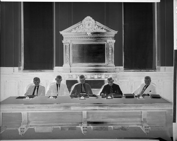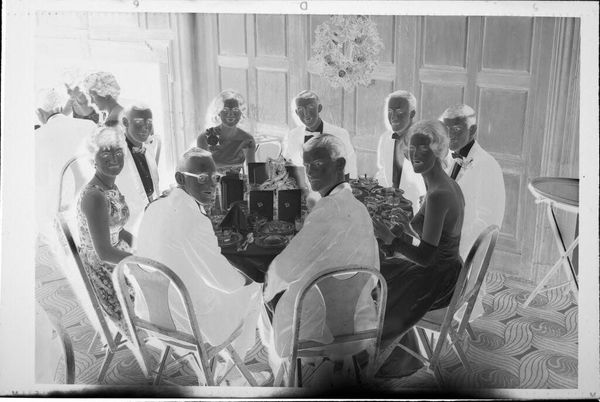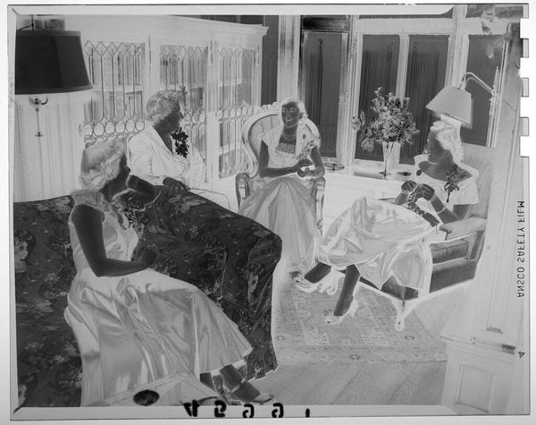 Editor: This is an untitled photograph by Martin Schweig, showing two men and two women formally dressed, sitting, and chatting in a fancy room. The inverted colors make the scene feel ghostly, almost like a memory. What stands out to you about this image? Curator: The formality, even in reverse, speaks volumes. The floral arrangements, the tailored suits, the positioning... it's a tableau of societal expectations, a performance of class. Consider the flowers—what might they signify in this context? A celebration? Or perhaps a symbol of fragility and fleeting beauty within a rigid social structure? Editor: I hadn’t thought of the flowers like that. I was just focused on the people. Curator: Exactly. The image invites us to consider how symbols operate and how they reinforce cultural narratives, even in seemingly casual moments. It prompts us to ask: what memories are being constructed and preserved here, and for whom? Editor: It’s interesting how much can be read into an image like this. Curator: Indeed. It encourages us to examine the cultural memory embedded within visual symbols.