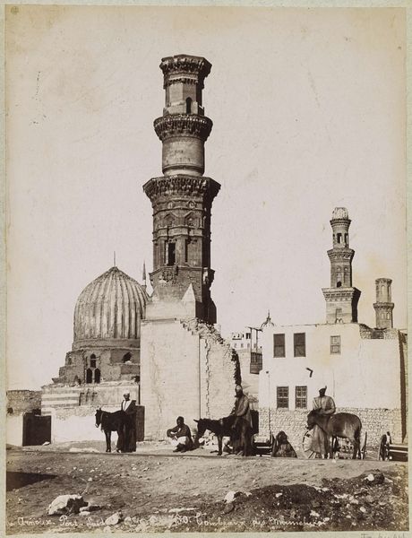 Curator: This is Félix Teynard's "Djirdjeh, Mosquée en Ruines Sur le Bord du Nil," a photograph taken between 1851 and 1852. Editor: It's haunting, this landscape. The ruinous architecture and muted tones convey such a powerful sense of time and loss. The stark, unadorned geometry focuses my attention. Curator: Indeed, the architectural elements are central. The photograph is carefully structured around the interplay of verticality—most prominently the minaret—and the horizontality established by the ruined structures. The tonal range also seems significant in articulating the structural aspects. Editor: The evident decay interests me from a material standpoint. Think of the labor that constructed this mosque, the resources extracted and shaped, only to crumble back into the earth. There's a poignant comment here on impermanence and the cyclical nature of creation and destruction that has been made manifest with material erosion. Curator: That's interesting. Teynard was trained as an engineer; do you think he conceived of the image itself as a commentary on the engineering feat inherent in its construction and eventual deconstruction? Editor: It's compelling to consider, isn’t it? Look at how he foregrounds the dilapidated stonework. He shows us not only the grand design, but also the vulnerable material reality—its disintegration under time's relentless pressure. How much was the location of Djirdjeh significant when choosing this specific structure and why at this stage of degradation? Curator: It could certainly be a factor, with perhaps allusions to a then relatively recent period of political instability. Considering that Djirdjeh—modern-day Girga—is slightly more inland, rather than directly along the Nile as the artwork's title states, this title may have rather intended to communicate a degree of exoticism more familiar to a European audience. Ultimately, however, the carefully controlled composition creates a visual rhythm through repeated forms, almost like a study in abstract shapes formed from material objects. Editor: This image offers more than just a historical record or even a comment on time; the deliberate choices in framing, material highlighting, and textural revelation lead us towards questions concerning legacy, ruin, and resilience inherent to these monuments to time. Curator: Indeed, a potent testament to enduring structural elements set against both the harsh realities and the beauty of decay.