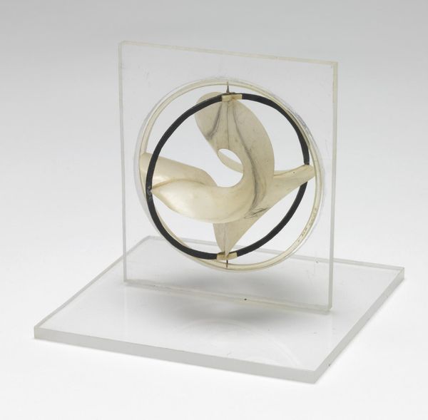 Curator: Before us we have Naum Gabo's "Construction on a Line," crafted in 1937. The piece employs mixed media in the Constructivist style. Editor: Wow. It’s so clean. Gives me this airy, almost mathematical vibe, like peering into a precisely calibrated dream. Does that black line cutting across symbolize some sort of rupture? Or is it just there to stir things up? Curator: Form is fundamental here. Note the use of geometric abstraction; the way line and shape interact. We must consider Gabo's engagement with materials—likely plastics or a similar mixed media. This allows the work to explore transparency and spatial dynamics. Editor: It almost floats. The clear panels layered so delicately...they make me think of those old anatomical drawings where you could flip pages to see layers of the body. But instead of flesh, it’s geometry. There's a certain poetry in how such rigid shapes manage to feel so fluid, like capturing smoke. Curator: Quite. The tension between line and plane becomes a subject worthy of scrutiny. What do these formal choices articulate? Is this about the underlying structure of the world, the essential forms? Gabo's modernism seems evident here, does it not? Editor: Absolutely! But what makes it so cool is that it almost doesn't want to be decoded. I’m also fascinated by what looks like a pendant structure—the artwork gives off an airy feel. Curator: Consider the time of its creation: 1937. Pre-war. Was Gabo envisioning some ideal form of progress, perhaps? An articulation of optimism through spatial logic? Editor: Perhaps, or maybe just playing with how lines create forms, then distort those forms into something otherworldly, don't you think? Looking at this I see the potential for chaos. Curator: It’s interesting to consider chaos versus calculated arrangement. Well, what I do think is that Gabo certainly compels us to ponder the interplay between the ideal and the real. Editor: Agreed! And it definitely prompts me to play around a bit with clear shapes! This piece really does stand the test of time!
