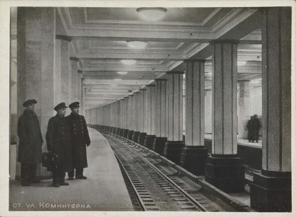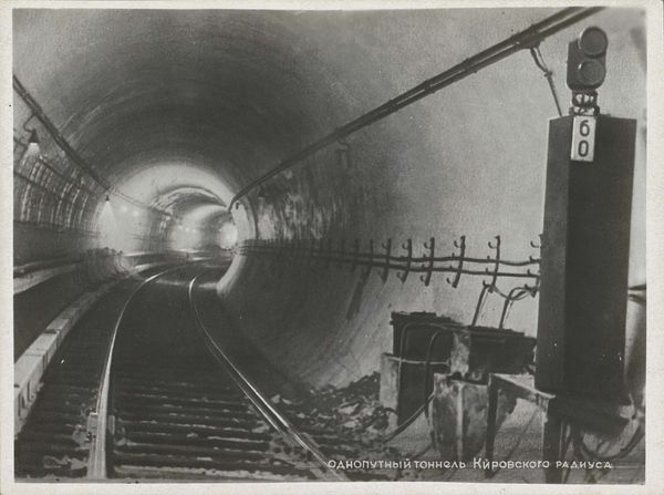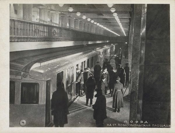Editor: This is a print of “Spoorbuis met dubbele rails op de Sokolnik-lijn” – which translates to “rail tube with double rails on the Sokolnik line" – made sometime between 1930 and 1935 by Mospo Sostawitol. It depicts a subway tunnel. It has an unsettling and mysterious mood. What’s your take on this photograph? Curator: It’s like stepping into a dream, isn't it? I mean, think about what Sostawitol is doing here. He's not just showing us a tunnel. He's showing us a vision of progress, a pathway to the future, and a slice of Soviet ambition. It reminds me of Piranesi's etchings of prisons, but instead of confinement, there's a sense of possibility... or is there? I keep asking myself whether Sostawitol intended it to feel so… well, so heavy. Editor: Heavy? Curator: Yes! It's as though he captured the grand ideals, but the reality weighs everything down. Look how the vanishing point sucks us into infinity. And it’s very symmetrical... like a dark mirror. Does that geometry offer stability, or does it become oppressive? What do you think? Editor: I guess I didn’t notice those subtleties initially. I just saw the city. Now I notice this disturbing quality you're pointing out, and the photo is making me think about urban planning in new ways! Curator: Isn’t it wonderful when a piece challenges us? Next time you’re underground, I hope you see it with new eyes. Maybe, Sostawitol can still surprise you after all these years!