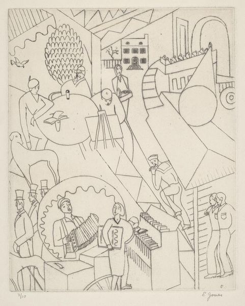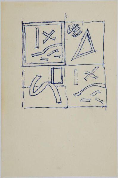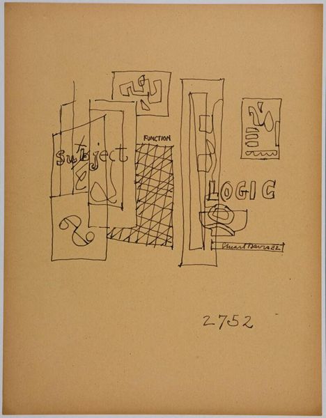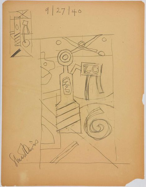 Curator: This is Stuart Davis’s “Study for ‘Ursine Park,’” a preparatory sketch now held at the Harvard Art Museums. It provides a glimpse into Davis’s creative process. Editor: It strikes me as quite chaotic at first glance. The composition is dense with lines and geometric shapes, all rendered in a stark, almost nervous, manner. Curator: Davis, deeply influenced by his time and by the socio-political landscape, used sketches like this to explore how urban and commercial environments could be translated into abstraction. Editor: Indeed. Look at how he reduces architectural forms to simple lines and planes. The visual language becomes a symbolic representation of urban spaces. Curator: This work speaks to the early 20th-century experience. It captures the energy of American modernity through its very fragmentation. Editor: For me, beyond the historical context, it is the tension between representation and abstraction that is most captivating. Curator: A vital glimpse into Davis’s exploration of a distinctly American visual vocabulary. Editor: A visual puzzle. One that leaves me eager to see how this study evolved into the final work.
