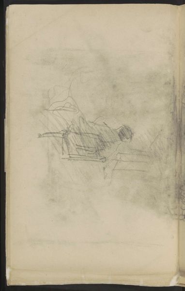 George Hendrik Breitner created this drawing, "Figuur onder een overkapping," with pencil. The composition immediately presents us with a study in lines, creating a sense of depth and enclosure. The stark contrasts between the dark, shaded areas and the bare paper evoke a contemplative mood. Breitner uses basic geometric forms to represent the structure of a shelter or room, creating an interplay between representation and abstraction. We might consider the influence of architectural drawing here, but note how it departs from precise documentation. The lines serve not just to define space but also to suggest shadow and light, manipulating our perception of form. Observe how Breitner challenges traditional perspective, inviting us to question the nature of the space, its reality versus its representation. This manipulation creates a visual tension that destabilizes fixed meanings, urging the viewer to engage in an active process of interpretation.