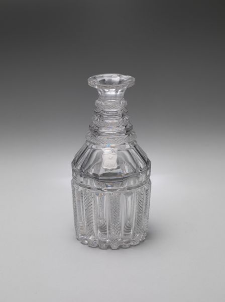 Curator: Here we have a stunning glass decanter, believed to have been crafted between 1826 and 1835 by Bakewell, Page & Bakewell. Editor: Immediately striking! The cut glass creates a dazzling play of light, and the piece gives off an aura of opulent functionality. It seems sturdy, meant to be used rather than just admired. Curator: Indeed. Bakewell, Page & Bakewell were known for their innovative glassmaking techniques. The intricate cutting wasn’t just decorative. It was a key part of establishing early American glass as desirable among affluent clientele, mimicking fancier European wares. Think about the skilled labor required to achieve such precision. Editor: That labor component interests me greatly. Consider the role this decanter might have played in a burgeoning market economy. Was it specifically for storing and displaying high-end goods, for a consumer culture where display became key? Curator: Precisely. This object sits at an interesting intersection, then: designed and consumed during the era when industrialization and mechanization increasingly impacted artisanal work, the handmade slowly giving way to mass production. The presence of the portrait too invites closer scrutiny in relation to the cultural values being projected. Editor: Yes, I notice the subtle inset portrait, seemingly classical. Is that a figure meant to associate the owner with certain intellectual traditions or societal affiliations? Who would commission such an elaborate item, and what statement did they wish to convey? It almost hints to a neoclassical fascination embedded within a practical drinking vessel. Curator: Exactly! Owning something of this quality certainly spoke of wealth and refinement. Moreover, placing an element from European classicism would signal that this was not an 'un-cultured' nouveau-riche home. This object performed socio-cultural functions. Editor: Reflecting on it now, the decanter exemplifies the material ambitions and artistic aspirations that arose with America’s growing commercial power. Curator: It's a testament to both skilled artisanship and the ways in which material objects can speak volumes about the society from which they emerged.