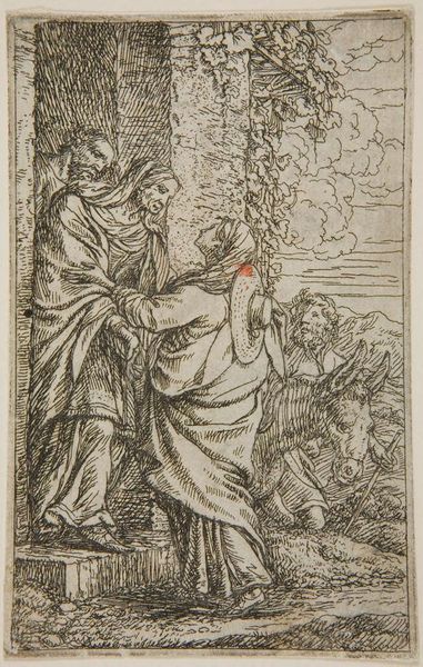 Editor: So, this is Jonas Umbach's "Christ and S. Peter on the Sea," which I find so compelling in its raw emotion. I am curious, what do you think Umbach is trying to convey with this particular scene? Curator: Well, to me, the frantic lines practically vibrate with the anxiety of faith tested. See how Peter reaches out, a gesture of both desperation and trust? It makes me wonder if Umbach himself wrestled with similar doubts, translating inner turmoil into this tempestuous sea. Editor: That's a powerful thought! It's like the etching itself is mirroring Peter's struggle. Curator: Exactly! And aren't those moments of doubt so deeply human? It's what makes this fleeting moment feel so timeless. Editor: Definitely food for thought. I'll never look at this the same way again. Thanks!