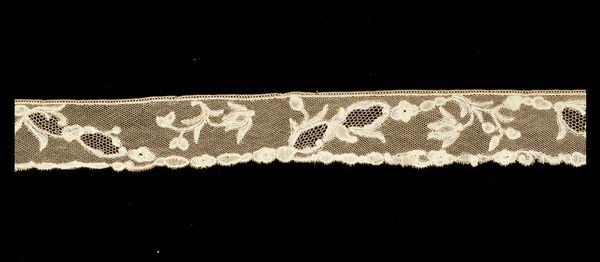 Curator: Oh, I see lace. My grandmother used to sew lace onto everything. It feels so…domestic, innocent, and old-fashioned all at once. Editor: And yet, "Band," this strip of 18th-century textile, whispers secrets beyond the merely domestic. It resides here at the Minneapolis Institute of Art as a silent witness to complex social dynamics. We know it only as by an Anonymous hand. Curator: Right. A detail like this, this weaving, probably adorned the dress of some powdered-wig person. Or perhaps it edged a christening gown, laden with hopes and expectations. Lace... it speaks of hidden desires. Editor: Hidden, yes. Consider the leaf pattern bordering one side; these designs frequently invoke not only fertility and growth but, historically, protection from unseen forces and blessings upon the wearer. The repetitive, almost tear-drop shape filling the band—they call to mind rain or seeds falling, the persistence of time. Curator: That’s intriguing. I was focused on the ephemeral aspect: delicacy and fragility. But you are right: even lace encodes a potent resilience. Think of the countless hours invested in crafting something so seemingly fragile. It feels paradoxical. Editor: A beautiful paradox. Woven into the seemingly decorative arts is a persistent memory of hope, protection, beauty – perhaps even resistance, coded in the intricate language of textile and design. It challenges us to re-evaluate what is considered frivolous or inconsequential. Curator: Yes. This delicate piece certainly carries much more than meets the eye, a tangible reminder that beauty is a kind of visual spell we weave and unweave through time. Editor: I agree. A fascinating peek into how we choose to ornament our lives and project certain hopes. Now I wonder where it ended up…