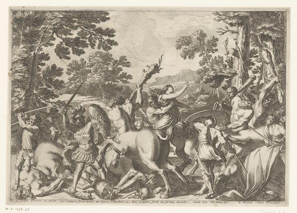 Editor: So, this is "Errant pendant la nuit..." or "Wandering by night…" by Claude Gillot, dating sometime between 1685 and 1722. It’s an engraving, so black lines on off-white paper, with a super chaotic scene full of nude figures and fantastical creatures. It feels… overwhelming, like a fever dream. What are your initial thoughts on this print? Curator: Overwhelming is a good word. It's teeming with imagery, a veritable cornucopia of symbols. Do you recognize any specific figures or recurring motifs that jump out at you? Editor: Well, there's a figure seated in the middle reading a book, surrounded by a kind of frenzy… almost Bacchanalian, but sinister? And what about the owl? Curator: Excellent observation! The seated figure certainly draws our eye, doesn't it? Consider the context of the time. During the Baroque period, images of night and wandering were often associated with folly and moral darkness. That central figure reading amidst the chaos – what does that juxtaposition suggest? And the owl – often a symbol of wisdom, but also of the nocturnal and hidden. Does its presence comfort or disturb you within this composition? Editor: I think it disturbs me. The owl above the seated figure seems to oversee the debauchery below, like a knowing participant rather than an objective observer. Is that the crescent moon a reference to the goddess Diana, always hanging around, an arbiter of night and its chaos? Curator: Precisely! The crescent moon hangs above. Now, look at the composition. The print feels divided into distinct zones of activity, from the dancing figures to the more grotesque creatures on the left. Could this be interpreted as a visual representation of the duality between reason and instinct, order and chaos, themes prevalent in the period’s intellectual discourse? Editor: It could definitely be that. I mean, with so much going on, it almost reads as a warning against the dangers of succumbing to those primal urges and abandoning reason. Is that Gillot trying to give viewers some insights into enduring truths, maybe? Curator: Perhaps, or maybe he is inviting viewers to grapple with these tensions themselves, showing cultural anxieties. Considering our conversation, this print certainly holds its symbolic weight through the ages, doesn't it? Editor: Definitely! It’s a potent reminder of how artists can tap into our deepest fears and desires through enduring symbols and themes. Thank you!
