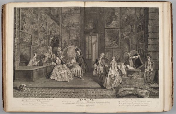 Curator: Good morning! Today, we’re standing before Cornelis Troost's, "Misled: The Ambassador of the Rascals Exposes himself from the Window of 't Bokki Tavern in the Haarlemmerhout,” painted sometime before 1750. It's quite a mouthful, I know! You can find it here at the Rijksmuseum. Editor: What strikes me immediately is the utter chaos—a comedic explosion rendered in oil. The colors are muted, yet the composition bubbles with unrestrained energy. It’s like a scene from a play, full of exaggerated gestures and comical figures. Curator: Absolutely, it is essentially a snapshot of 18th-century Dutch social life presented as a morality play. Troost was heavily influenced by theatre, which informed his approach to narrative painting. What is visually unfolding is rich with the satire of social classes and norms. It highlights, perhaps, the underbelly of the Dutch Golden Age. Editor: And that “underbelly” is wonderfully rendered. The fellow hanging precariously from the tree, mirroring the 'ambassador' leaning out of the window above - it speaks to mirroring behaviours, the follies of man played out in different ways. This painting uses symbolic language and cultural archetypes for comedy. Even the name of the tavern, "Bokki Tavern," could have symbolical connotations with "Bok" resembling someone perceived as goat or fool. Curator: A sharp eye indeed! You know the Dutch were very keen on this genre of painting. I see this work functioning as a sort of public service announcement on moral laxity and societal norms of its time. Editor: I am equally drawn to the figures seated quietly observing this theatrical happening - perhaps standing in for us as viewers. Their dark and serious demeanor are a powerful and silent statement in this carnival of the senses. They observe, detached, yet present; embodying judgment and critique through their reserved posture. They serve as a symbolic bridge between the unruly spectacle and our reflective interpretation. Curator: An excellent interpretation! Ultimately, Troost manages to offer not just entertainment, but a canvas ripe with cultural insights, using the comedic and bawdy as a way to comment on society. Editor: A canvas full of humanity, hubris, and hilarity – all swirling together. A delightful memento mori, isn't it? It encourages us to ponder, laugh, and perhaps learn from the amusing shortcomings depicted.