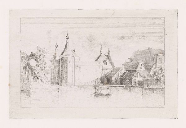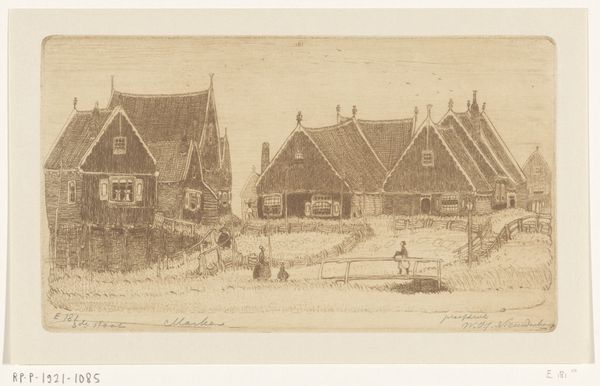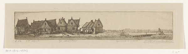 Editor: This etching by Wijnand Otto Jan Nieuwenkamp, titled "View of the Island of Marken," was created in 1896. It’s incredibly detailed, a cityscape rendered in delicate lines. It evokes a feeling of serenity and simplicity. What symbols or visual cues stand out to you? Curator: The village itself becomes a symbol, doesn’t it? A collection of individual homes clustered together, representing community, resilience, perhaps even isolation in their island setting. Editor: Isolation? I hadn't considered that. Curator: The artist meticulously etched each building, their similar forms creating a visual rhythm, like musical notation. Think about it: water often signifies the unconscious, the unknown. Being surrounded by it, as the inhabitants of Marken are, underscores a psychological separation from the mainland, both physically and perhaps emotionally. Notice how the light reflects this? Editor: So, the etching becomes more than just a representation of a place. It's a portrayal of a state of mind. The uniform houses repeat shapes – steep roofs, dark rectangles - that become more profound, and the whole scene becomes symbolic. Curator: Exactly! Consider the horizon line, too. It’s low, giving prominence to the village. Perhaps an assertion of cultural identity against the vastness of nature, but is the water's edge blurred, obscuring where water ends and land begins, a constant negotiation with its environment? What do you think about how form influences this artwork's meaning? Editor: It's fascinating how the seemingly simple act of depicting a place can be so layered with meaning and memories through form. I definitely see the island's form as its cultural identity. Thanks so much for this interpretation. Curator: My pleasure! Every viewing offers fresh meaning, every line holds cultural memory.