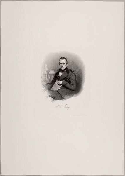 Curator: Lazarus Gottlieb Sichling gifted us this portrait of Francis Calley Gray. I'm immediately struck by its reserved elegance. Editor: Absolutely. The lithograph emanates a certain stoicism. Gray's formal attire and the backdrop hint at a world of institutional power. I wonder, what was the historical context for commissioning this artwork? Curator: Sichling, active in the mid-19th century, was known for these kinds of stately portraits. There's a kind of quiet melancholy in his face, don't you think? Editor: Perhaps. Or maybe it's a reflection of the weight of his societal position. These depictions are never neutral; they project very specific ideals and reinforce social structures. Curator: It's intriguing to consider how Sichling's technical skill meets the expectations of portraiture. A dance between artist and patron, each leaving their mark. Editor: Precisely. And analyzing that negotiation is key to understanding the full picture—or in this case, the portrait. Curator: A captivating glimpse into a bygone era, filtered through the eyes of two artists, in a way. Editor: Indeed, it’s a prompt to consider how images shape our understanding of history.