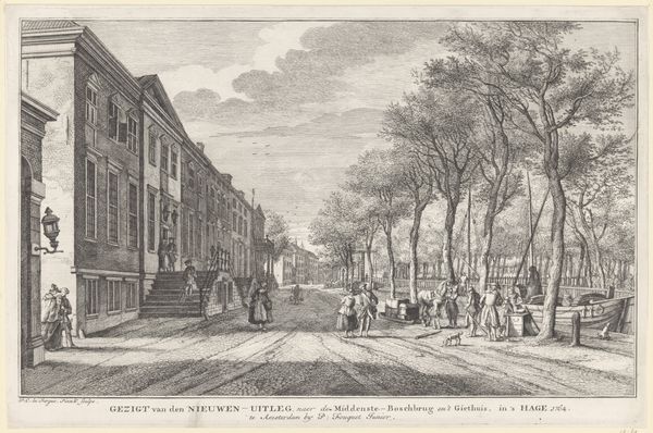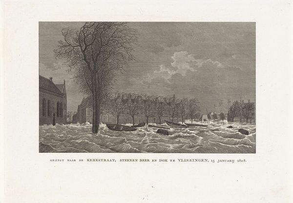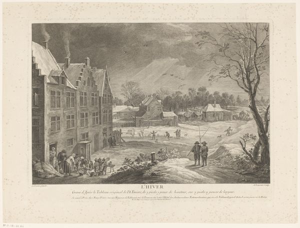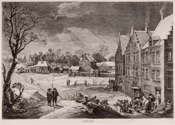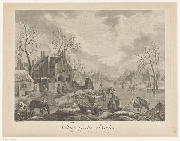 Curator: This watercolor painting, created between 1814 and 1816 by Willem Hendrik Hoogkamer, is titled "Sneeuwlandschap met soldaten in gesprek met burgers tijdens het beleg van Naarden," which translates to "Snow landscape with soldiers talking to citizens during the siege of Naarden." Editor: My first thought is that the scene evokes a real sense of desolation and tension. The stark contrast of the snowy landscape and the weighty subject matter—a military siege—creates a feeling of unease. Curator: Absolutely. Hoogkamer masterfully captured a moment in time during a tumultuous period in Dutch history, reflecting the political climate of the early 19th century. We have the soldiers, representing military occupation, juxtaposed with ordinary citizens of Naarden. It is the historical intersection of national interests and localized civic experience. Editor: The presence of snow seems symbolic as well. Snow is a great neutralizer, creating both quietude and concealment. I wonder if its purpose is to indicate the disruption of regular civilian life. Also, the bare, frosty trees emphasize the lack of warmth, hinting at a certain vulnerability or resilience of the Dutch people depicted. Even the dog appears pensive. Curator: That's a fascinating interpretation! I agree the artist might be leveraging the weather to underscore themes. I see it as Hoogkamer trying to shape national memory by portraying an episode like the Siege of Naarden. The scene isn’t purely a record; it also frames how this event should be remembered in the context of Dutch identity and nationalism. Editor: Considering Naarden's fortifications, traditionally a defensive stronghold, it seems its citizens are in conversation with their occupiers, an effort, no doubt, at negotiation. The weight of what has happened, what is happening, and what will happen resides on the faces of those depicted. Curator: A very astute analysis! Indeed, these watercolors offered commentary on social upheaval through everyday town life. Hoogkamer uses art as a mirror, reflecting societal power structures and impacting how future generations perceived those trying times. Editor: A perfect point to end on. The bleak beauty here holds more than historical information—it holds collective human emotions experienced in a single place in a singular moment in time.