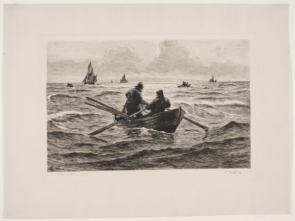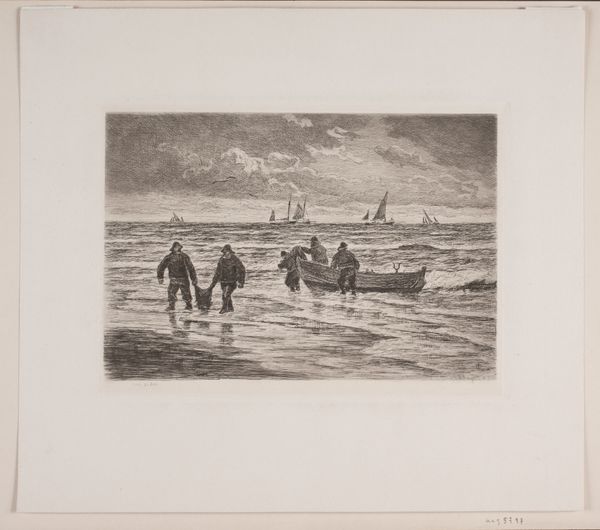 Carl Locher created this etching, "Fiskerbåd i brændingen," depicting a group of fishermen navigating turbulent waters in their boat. Locher, who lived from 1851 to 1915, produced this print during a period of significant social and economic change in Denmark, where fishing communities played a vital role. The etching evokes the profound connection between the fishermen and the sea, portraying their daily struggle for survival. These men were at the mercy of nature's power, challenging traditional notions of masculinity by displaying both strength and vulnerability in their arduous labor. Notice how the artist skillfully conveys the emotional intensity and the sheer physical demand of their work. Locher's "Fiskerbåd i brændingen" invites us to consider the lives of these men. We can reflect on the complex interplay between human existence, labor, and the imposing force of nature, while exploring themes of survival, identity, and social change.